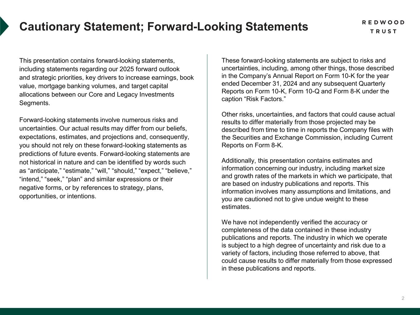 2 This presentation contains forward-looking statements, including statements regarding our 2025 forward outlook and strategic priorities, key drivers to increase earnings, book value, mortgage banking volumes, and target capital allocations between our Core and Legacy Investments Segments. Forward-looking statements involve numerous risks and uncertainties. Our actual results may differ from our beliefs, expectations, estimates, and projections and, consequently, you should not rely on these forward-looking statements as predictions of future events. Forward-looking statements are not historical in nature and can be identified by words such as “anticipate,” “estimate,” “will,” “should,” “expect,” “believe,” “intend,” “seek,” “plan” and similar expressions or their negative forms, or by references to strategy, plans, opportunities, or intentions. Cautionary Statement; Forward-Looking Statements These forward-looking statements are subject to risks and uncertainties, including, among other things, those described in the Company’s Annual Report on Form 10-K for the year ended December 31, 2024 and any subsequent Quarterly Reports on Form 10-K, Form 10-Q and Form 8-K under the caption “Risk Factors.” Other risks, uncertainties, and factors that could cause actual results to differ materially from those projected may be described from time to time in reports the Company files with the Securities and Exchange Commission, including Current Reports on Form 8-K. Additionally, this presentation contains estimates and information concerning our industry, including market size and growth rates of the markets in which we participate, that are based on industry publications and reports. This information involves many assumptions and limitations, and you are cautioned not to give undue weight to these estimates. We have not independently verified the accuracy or completeness of the data contained in these industry publications and reports. The industry in which we operate is subject to a high degree of uncertainty and risk due to a variety of factors, including those referred to above, that could cause results to differ materially from those expressed in these publications and reports.