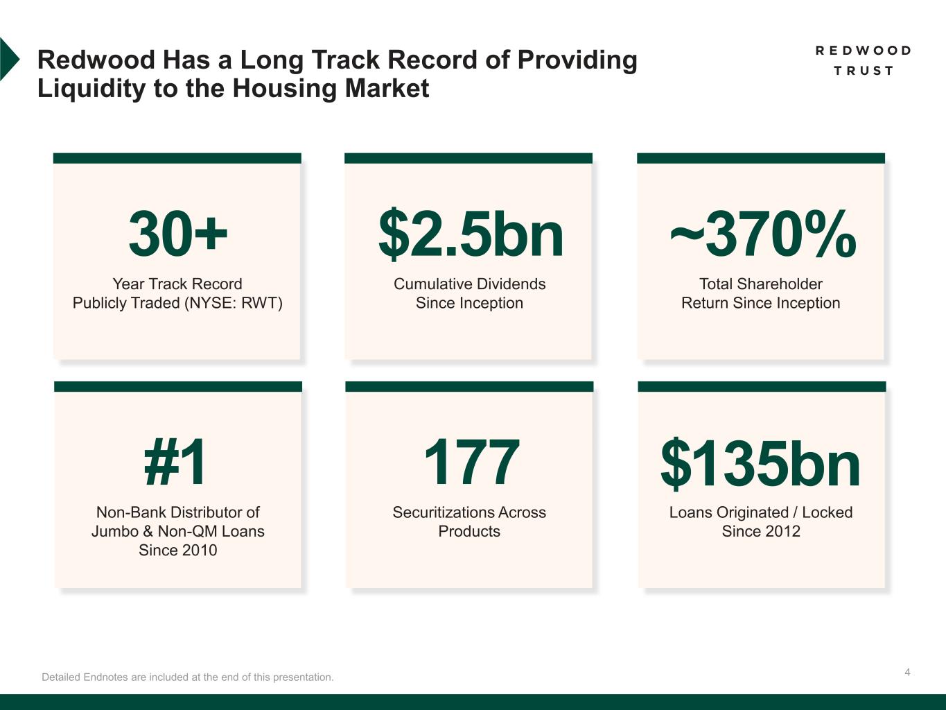 3 Redwood Trust – Business Overview Detailed Endnotes are included at the end of this presentation. For Banks & Lenders We support lower rates by purchasing mortgages from lenders, allowing them to recycle their capital and make new loans For Institutional Investors We distribute customized mortgage and other housing related assets Our Mission To make quality housing, whether rented or owned, accessible to all American households Our Core Segments Jumbo Residential Loans Residential Investor Loans Alternative Residential Products Housing-Focused Assets Created by Redwood Investments Operating Platforms