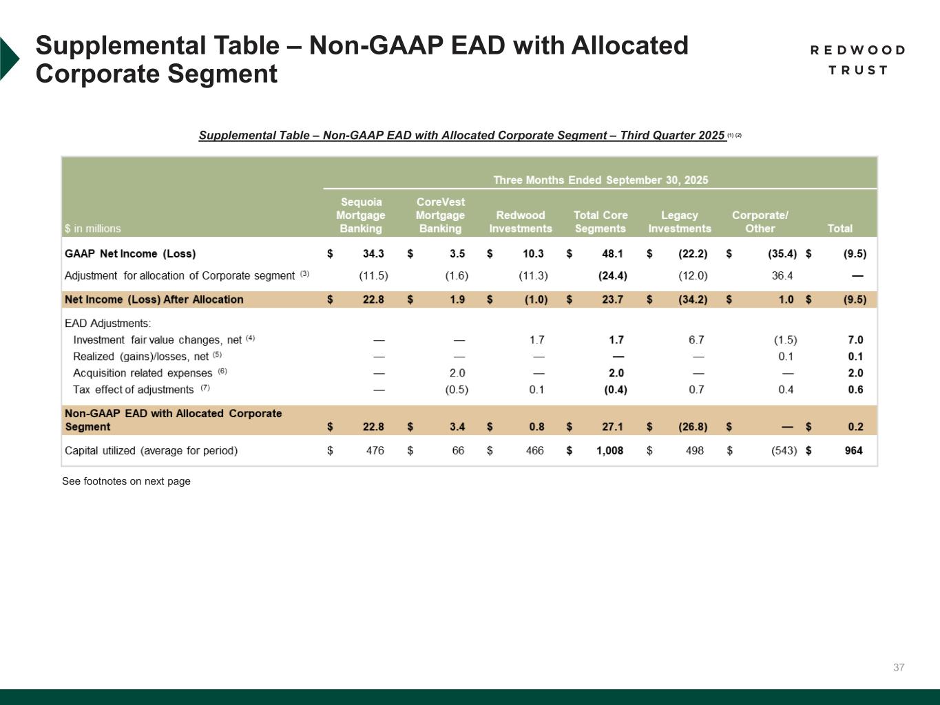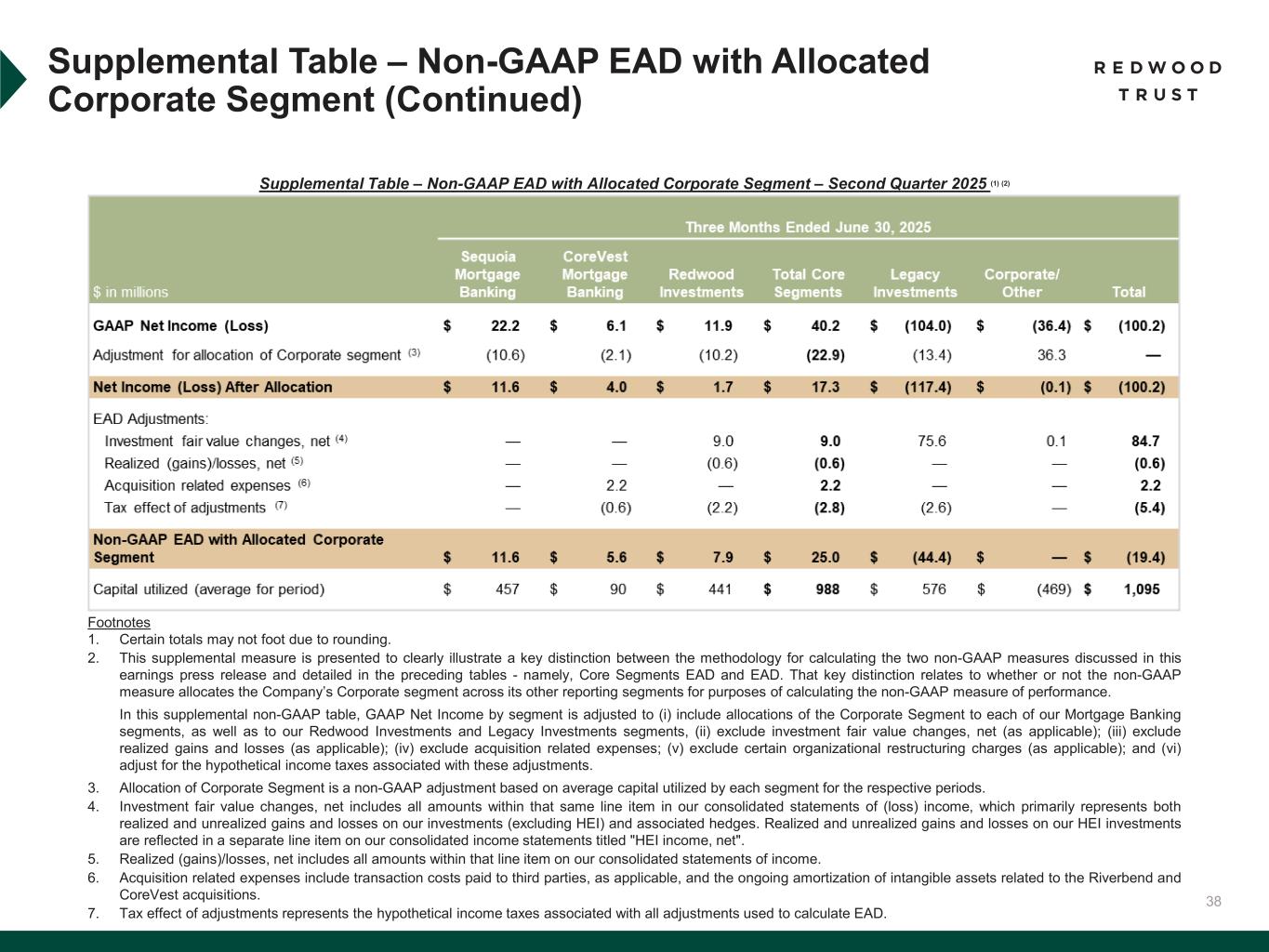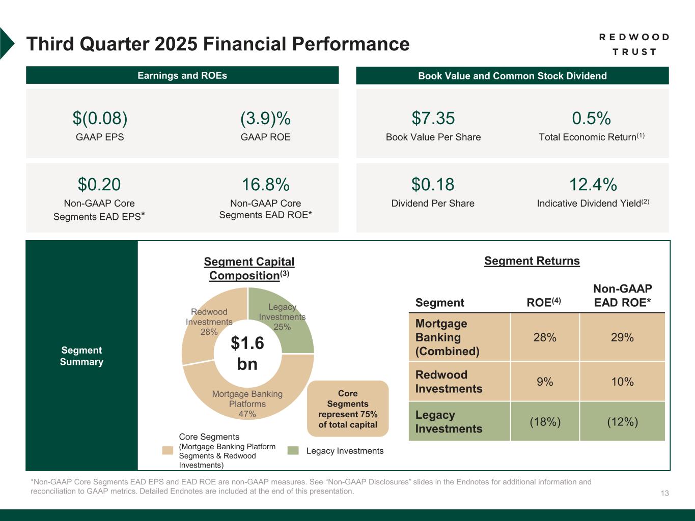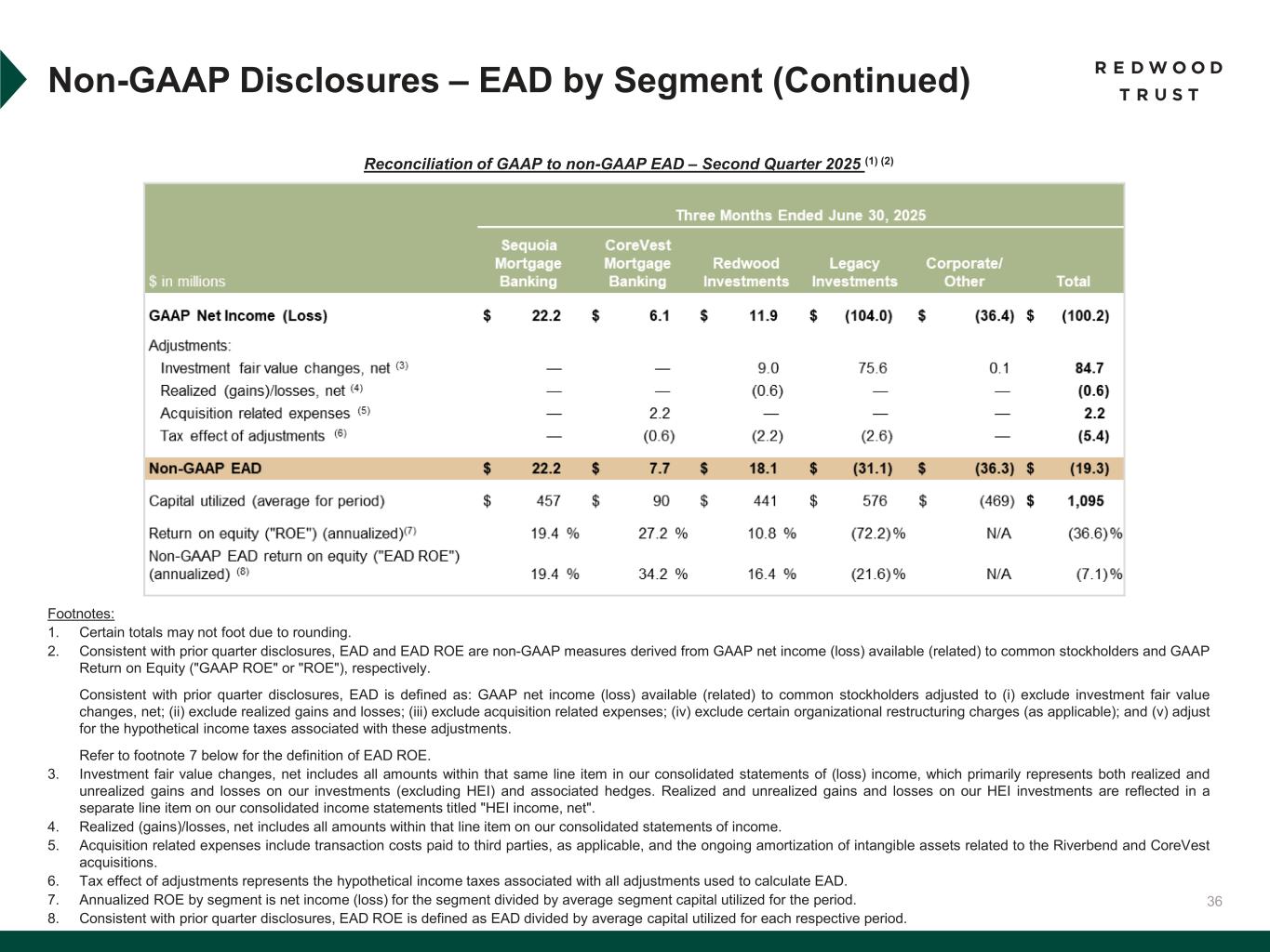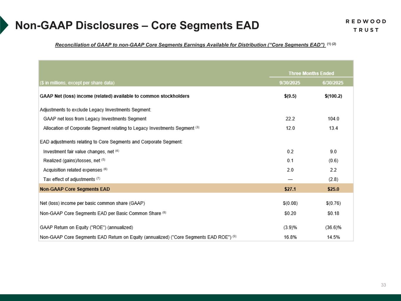 31 To supplement consolidated and segment financial information prepared and presented in accordance with U.S. generally accepted accounting principles ("GAAP"), the Company also provides the following non-GAAP measures: • Core Segments Earnings Available for Distribution (“Core Segments EAD”) • Earnings Available for Distribution (“EAD”) Management believes these non-GAAP measures provide supplemental information to assist management and investors in analyzing the Company’s results of operations and help facilitate comparisons to industry peers. Management also believes that these non-GAAP measures are metrics that can supplement its analysis of the Company’s ability to pay dividends, by providing an indication of the current income generating capacity of the Company's operating platforms as of the quarter being presented. In addition, management believes its non-GAAP Core Segments EAD measure provide supplemental information to assist management and investors in analyzing the Company’s in process transition to a more scalable and simplified business model, which includes a wind-down of legacy portfolio holdings within its recently- established Legacy Investments segment. These non-GAAP measures should not be utilized in isolation, nor should they be considered as an alternative to GAAP net income (loss) available (related) to common stockholders, GAAP ROE or other measurements of results of operations computed in accordance with GAAP or for federal income tax purposes. Core Segments EAD. Core Segments EAD and Core Segments EAD ROE are non-GAAP measures established in the second quarter 2025 and are used to present management’s non-GAAP analysis (based on its non-GAAP Earnings Available for Distribution (“EAD”) measure further described below) of the combined performance the Company’s mortgage banking platforms and related investments (which consist of the Company’s Sequoia Mortgage Banking, CoreVest Mortgage Banking and Redwood Investments segments and are defined as the Company’s “Core Segments”, inclusive of an allocated portion of the Company’s Corporate segment relating to those segments). • Core Segments EAD excludes the Company’s Legacy Investments segment and excludes an allocated portion of the Company’s Corporate segment relating to the Legacy Investments segment. • Core Segments EAD per basic common share and Core Segments EAD ROE are also non-GAAP measures established in the second quarter 2025 and are calculated using Core Segments EAD. • Core Segments EAD ROE is defined as Core Segments EAD divided by average capital attributable to Core Segments. A further discussion of Core Segments EAD and a reconciliation of our non-GAAP Core Segments EAD measures to comparable GAAP measures is set forth below under the heading “Reconciliation of GAAP to non-GAAP Core Segments EAD”. Non-GAAP Disclosures