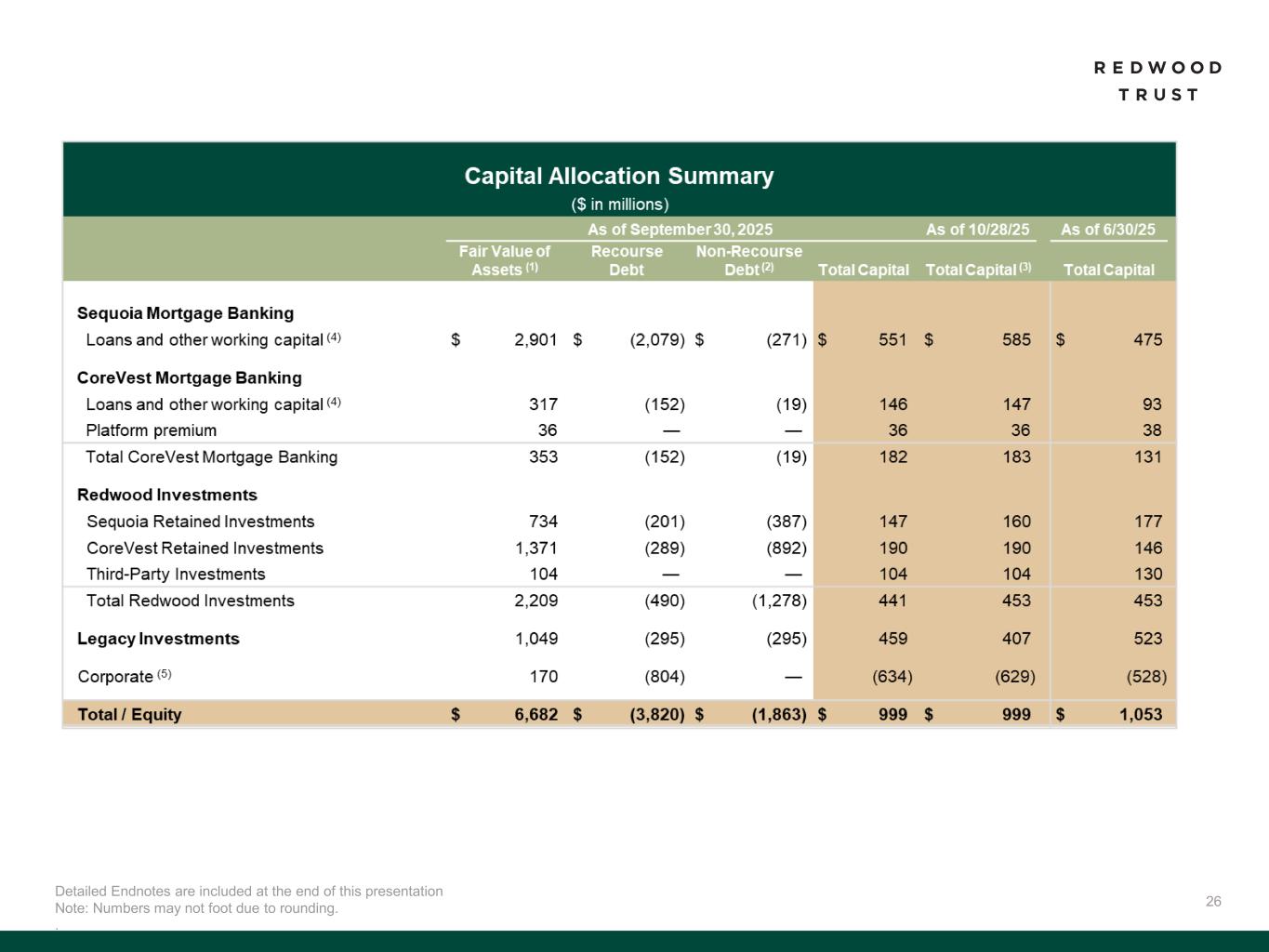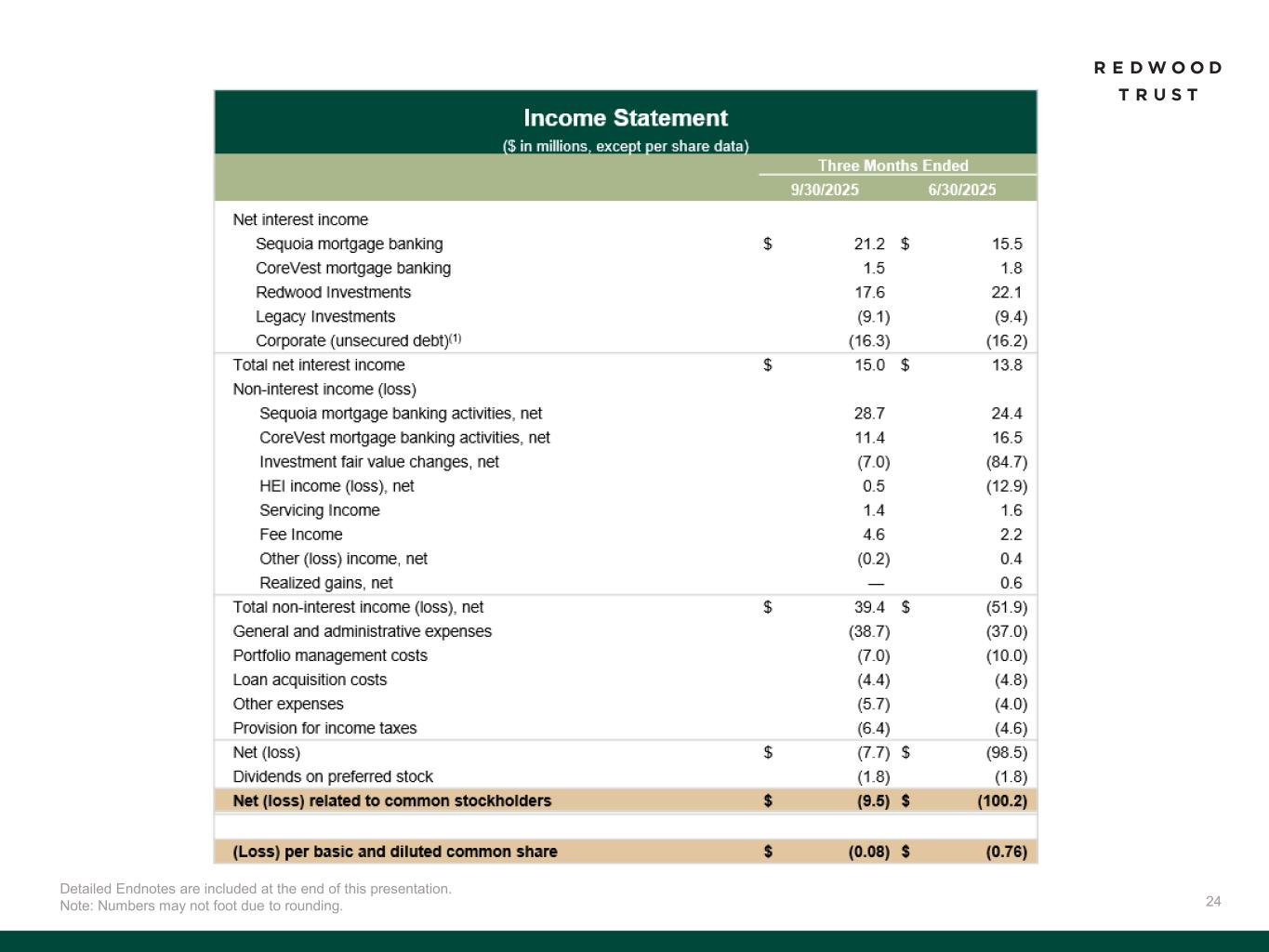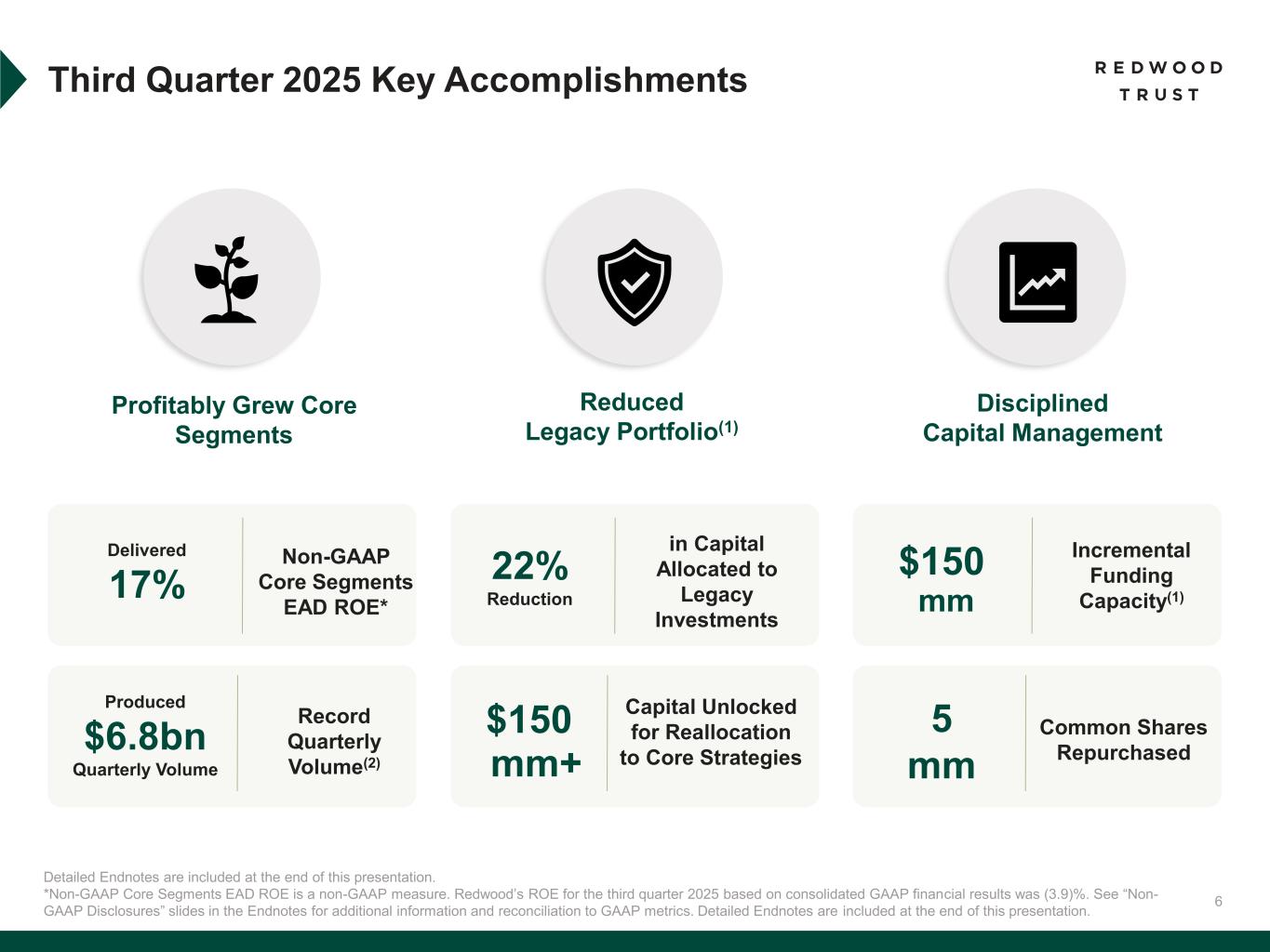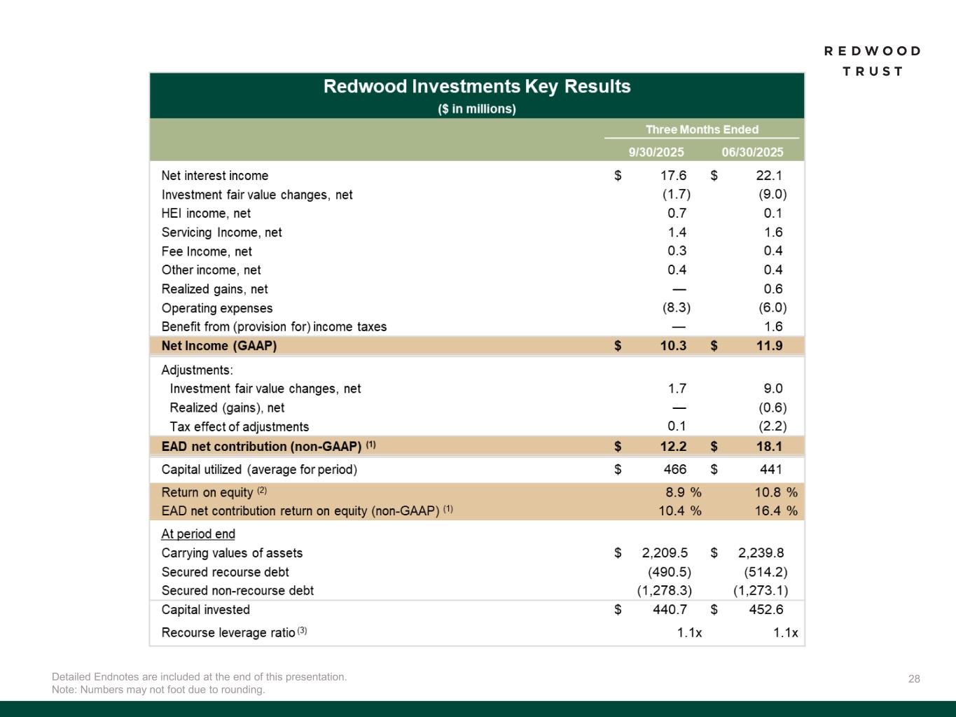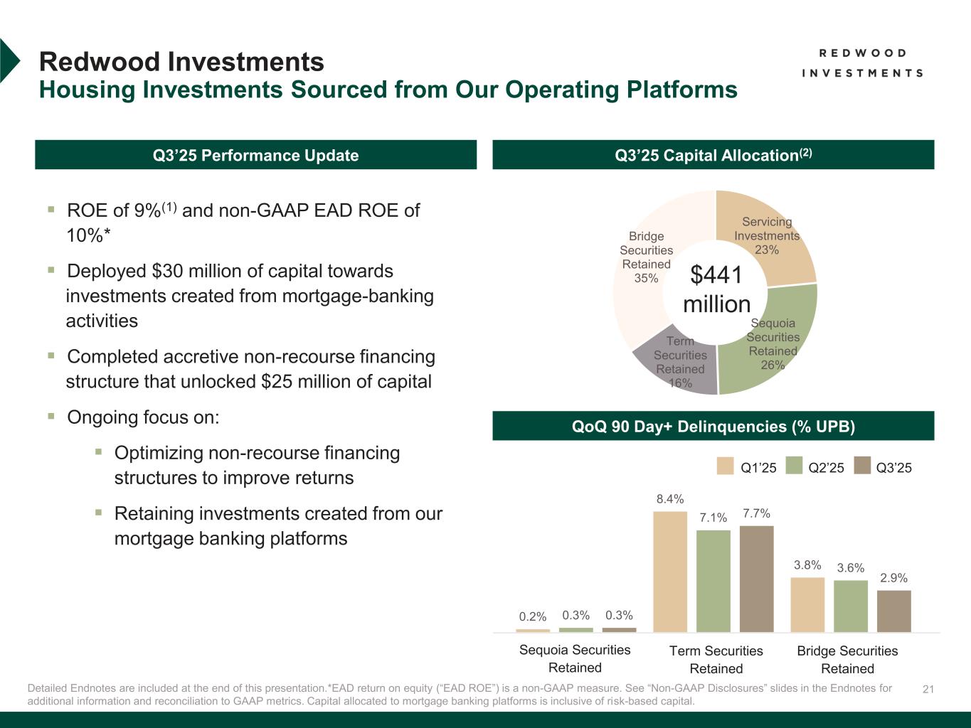 31 To supplement consolidated and segment financial information prepared and presented in accordance with U.S. generally accepted accounting principles ("GAAP"), the Company also provides the following non-GAAP measures: • Core Segments Earnings Available for Distribution (“Core Segments EAD”) • Earnings Available for Distribution (“EAD”) Management believes these non-GAAP measures provide supplemental information to assist management and investors in analyzing the Company’s results of operations and help facilitate comparisons to industry peers. Management also believes that these non-GAAP measures are metrics that can supplement its analysis of the Company’s ability to pay dividends, by providing an indication of the current income generating capacity of the Company's operating platforms as of the quarter being presented. In addition, management believes its non-GAAP Core Segments EAD measure provide supplemental information to assist management and investors in analyzing the Company’s in process transition to a more scalable and simplified business model, which includes a wind-down of legacy portfolio holdings within its recently- established Legacy Investments segment. These non-GAAP measures should not be utilized in isolation, nor should they be considered as an alternative to GAAP net income (loss) available (related) to common stockholders, GAAP ROE or other measurements of results of operations computed in accordance with GAAP or for federal income tax purposes. Core Segments EAD. Core Segments EAD and Core Segments EAD ROE are non-GAAP measures established in the second quarter 2025 and are used to present management’s non-GAAP analysis (based on its non-GAAP Earnings Available for Distribution (“EAD”) measure further described below) of the combined performance the Company’s mortgage banking platforms and related investments (which consist of the Company’s Sequoia Mortgage Banking, CoreVest Mortgage Banking and Redwood Investments segments and are defined as the Company’s “Core Segments”, inclusive of an allocated portion of the Company’s Corporate segment relating to those segments). • Core Segments EAD excludes the Company’s Legacy Investments segment and excludes an allocated portion of the Company’s Corporate segment relating to the Legacy Investments segment. • Core Segments EAD per basic common share and Core Segments EAD ROE are also non-GAAP measures established in the second quarter 2025 and are calculated using Core Segments EAD. • Core Segments EAD ROE is defined as Core Segments EAD divided by average capital attributable to Core Segments. A further discussion of Core Segments EAD and a reconciliation of our non-GAAP Core Segments EAD measures to comparable GAAP measures is set forth below under the heading “Reconciliation of GAAP to non-GAAP Core Segments EAD”. Non-GAAP Disclosures