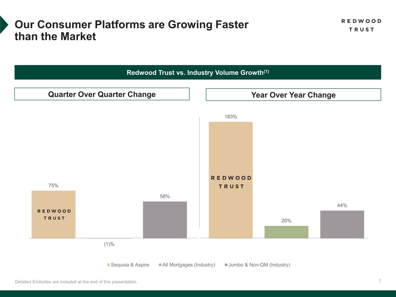 6 Third Quarter 2025 Key Accomplishments Detailed Endnotes are included at the end of this presentation. *Non-GAAP Core Segments EAD ROE is a non-GAAP measure. Redwood’s ROE for the third quarter 2025 based on consolidated GAAP financial results was (3.9)%. See “Non- GAAP Disclosures” slides in the Endnotes for additional information and reconciliation to GAAP metrics. Detailed Endnotes are included at the end of this presentation. Reduced Legacy Portfolio(1) Profitably Grew Core Segments Disciplined Capital Management Non-GAAP Core Segments EAD ROE* Delivered 17% Record Quarterly Volume(2) Produced $6.8bn Quarterly Volume Incremental Funding Capacity(1) Common Shares Repurchased 5 mm 22% Reduction in Capital Allocated to Legacy Investments Capital Unlocked for Reallocation to Core Strategies $150 mm+ $150 mm