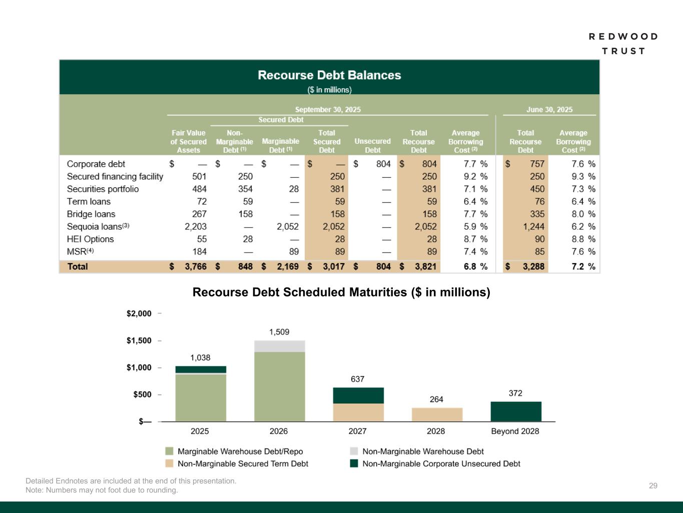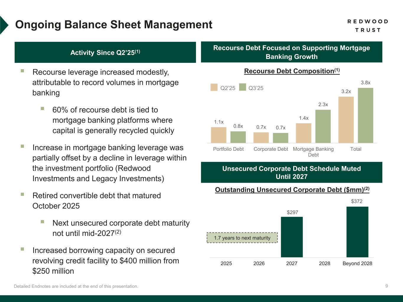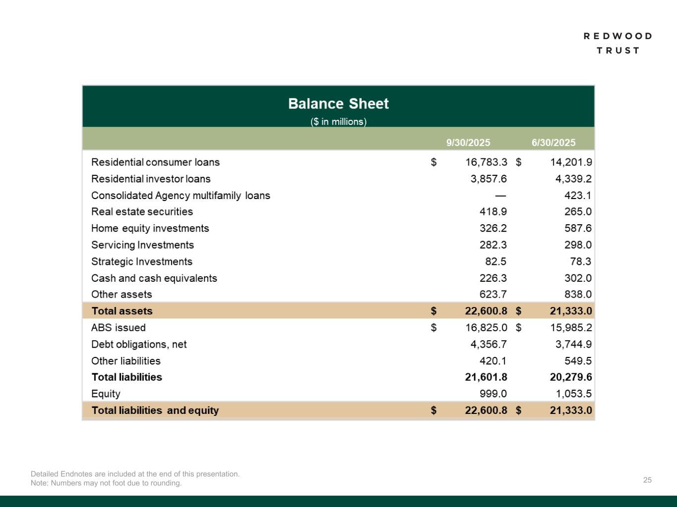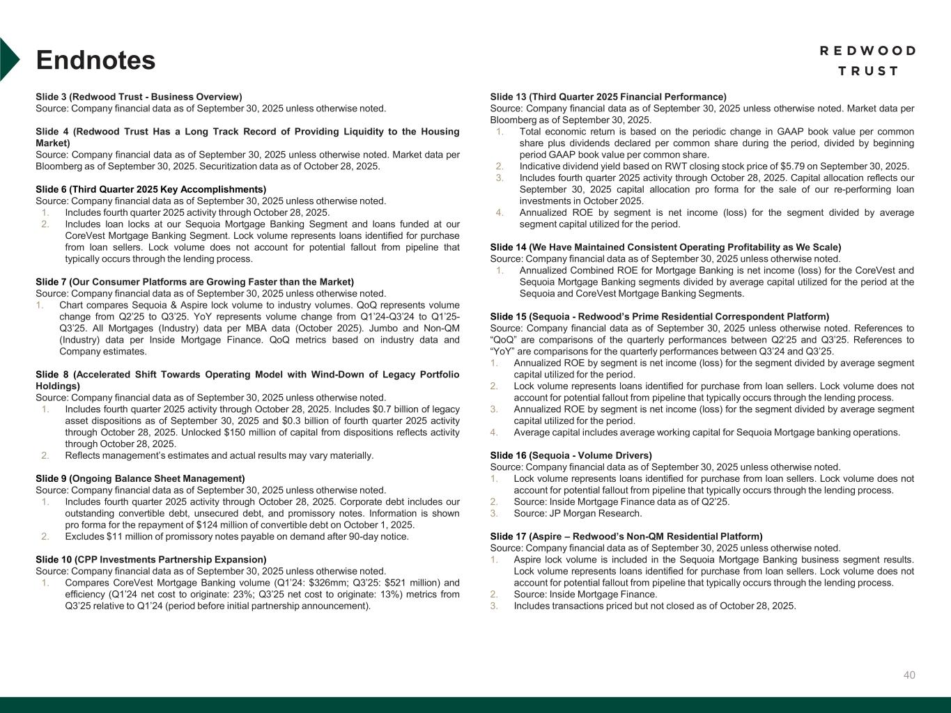 40 Slide 3 (Redwood Trust - Business Overview)​ Source: Company financial data as of September 30, 2025 unless otherwise noted. Slide 4 (Redwood Trust Has a Long Track Record of Providing Liquidity to the Housing Market)​ Source: Company financial data as of September 30, 2025 unless otherwise noted. Market data per Bloomberg as of September 30, 2025. Securitization data as of October 28, 2025. Slide 6 (Third Quarter 2025 Key Accomplishments)​ Source: Company financial data as of September 30, 2025 unless otherwise noted. 1. Includes fourth quarter 2025 activity through October 28, 2025. 2. Includes loan locks at our Sequoia Mortgage Banking Segment and loans funded at our CoreVest Mortgage Banking Segment. Lock volume represents loans identified for purchase from loan sellers. Lock volume does not account for potential fallout from pipeline that typically occurs through the lending process. Slide 7 (Our Consumer Platforms are Growing Faster than the Market)​ Source: Company financial data as of September 30, 2025 unless otherwise noted. 1. Chart compares Sequoia & Aspire lock volume to industry volumes. QoQ represents volume change from Q2’25 to Q3’25. YoY represents volume change from Q1’24-Q3’24 to Q1’25- Q3’25. All Mortgages (Industry) data per MBA data (October 2025). Jumbo and Non-QM (Industry) data per Inside Mortgage Finance. QoQ metrics based on industry data and Company estimates. Slide 8 (Accelerated Shift Towards Operating Model with Wind-Down of Legacy Portfolio Holdings)​ Source: Company financial data as of September 30, 2025 unless otherwise noted. 1. Includes fourth quarter 2025 activity through October 28, 2025. Includes $0.7 billion of legacy asset dispositions as of September 30, 2025 and $0.3 billion of fourth quarter 2025 activity through October 28, 2025. Unlocked $150 million of capital from dispositions reflects activity through October 28, 2025. 2. Reflects management’s estimates and actual results may vary materially. Slide 9 (Ongoing Balance Sheet Management)​ Source: Company financial data as of September 30, 2025 unless otherwise noted. 1. Includes fourth quarter 2025 activity through October 28, 2025. Corporate debt includes our outstanding convertible debt, unsecured debt, and promissory notes. Information is shown pro forma for the repayment of $124 million of convertible debt on October 1, 2025. 2. Excludes $11 million of promissory notes payable on demand after 90-day notice. Slide 10 (CPP Investments Partnership Expansion)​ Source: Company financial data as of September 30, 2025 unless otherwise noted. 1. Compares CoreVest Mortgage Banking volume (Q1’24: $326mm; Q3’25: $521 million) and efficiency (Q1’24 net cost to originate: 23%; Q3’25 net cost to originate: 13%) metrics from Q3’25 relative to Q1’24 (period before initial partnership announcement). Endnotes Slide 13 (Third Quarter 2025 Financial Performance)​ Source: Company financial data as of September 30, 2025 unless otherwise noted. Market data per Bloomberg as of September 30, 2025. 1. Total economic return is based on the periodic change in GAAP book value per common share plus dividends declared per common share during the period, divided by beginning period GAAP book value per common share. 2. Indicative dividend yield based on RWT closing stock price of $5.79 on September 30, 2025. 3. Includes fourth quarter 2025 activity through October 28, 2025. Capital allocation reflects our September 30, 2025 capital allocation pro forma for the sale of our re-performing loan investments in October 2025. 4. Annualized ROE by segment is net income (loss) for the segment divided by average segment capital utilized for the period. Slide 14 (We Have Maintained Consistent Operating Profitability as We Scale)​ Source: Company financial data as of September 30, 2025 unless otherwise noted. 1. Annualized Combined ROE for Mortgage Banking is net income (loss) for the CoreVest and Sequoia Mortgage Banking segments divided by average capital utilized for the period at the Sequoia and CoreVest Mortgage Banking Segments. Slide 15 (Sequoia - Redwood’s Prime Residential Correspondent Platform)​ Source: Company financial data as of September 30, 2025 unless otherwise noted. References to “QoQ” are comparisons of the quarterly performances between Q2’25 and Q3’25. References to “YoY” are comparisons for the quarterly performances between Q3’24 and Q3’25. 1. Annualized ROE by segment is net income (loss) for the segment divided by average segment capital utilized for the period. 2. Lock volume represents loans identified for purchase from loan sellers. Lock volume does not account for potential fallout from pipeline that typically occurs through the lending process. 3. Annualized ROE by segment is net income (loss) for the segment divided by average segment capital utilized for the period. 4. Average capital includes average working capital for Sequoia Mortgage banking operations. Slide 16 (Sequoia - Volume Drivers)​ Source: Company financial data as of September 30, 2025 unless otherwise noted. 1. Lock volume represents loans identified for purchase from loan sellers. Lock volume does not account for potential fallout from pipeline that typically occurs through the lending process. 2. Source: Inside Mortgage Finance data as of Q2’25. 3. Source: JP Morgan Research. Slide 17 (Aspire – Redwood’s Non-QM Residential Platform)​ Source: Company financial data as of September 30, 2025 unless otherwise noted. 1. Aspire lock volume is included in the Sequoia Mortgage Banking business segment results. Lock volume represents loans identified for purchase from loan sellers. Lock volume does not account for potential fallout from pipeline that typically occurs through the lending process. 2. Source: Inside Mortgage Finance. 3. Includes transactions priced but not closed as of October 28, 2025.