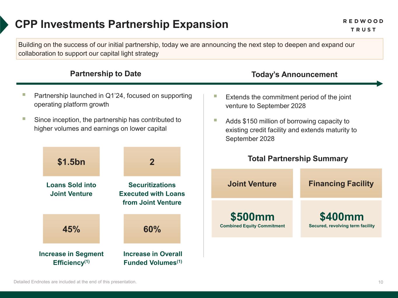 9 Ongoing Balance Sheet Management Detailed Endnotes are included at the end of this presentation. Activity Since Q2’25(1) ▪ Recourse leverage increased modestly, attributable to record volumes in mortgage banking ▪ 60% of recourse debt is tied to mortgage banking platforms where capital is generally recycled quickly ▪ Increase in mortgage banking leverage was partially offset by a decline in leverage within the investment portfolio (Redwood Investments and Legacy Investments) ▪ Retired convertible debt that matured October 2025 ▪ Next unsecured corporate debt maturity not until mid-2027(2) ▪ Increased borrowing capacity on secured revolving credit facility to $400 million from $250 million $297 $372 2025 2026 2027 2028 Beyond 2028 1.7 years to next maturity Recourse Debt Focused on Supporting Mortgage Banking Growth Unsecured Corporate Debt Schedule Muted Until 2027 Outstanding Unsecured Corporate Debt ($mm)(2) Recourse Debt Composition(1) Q3’25Q2’25 1.1x 0.7x 1.4x 3.2x 0.8x 0.7x 2.3x 3.8x Portfolio Debt Corporate Debt Mortgage Banking Debt Total