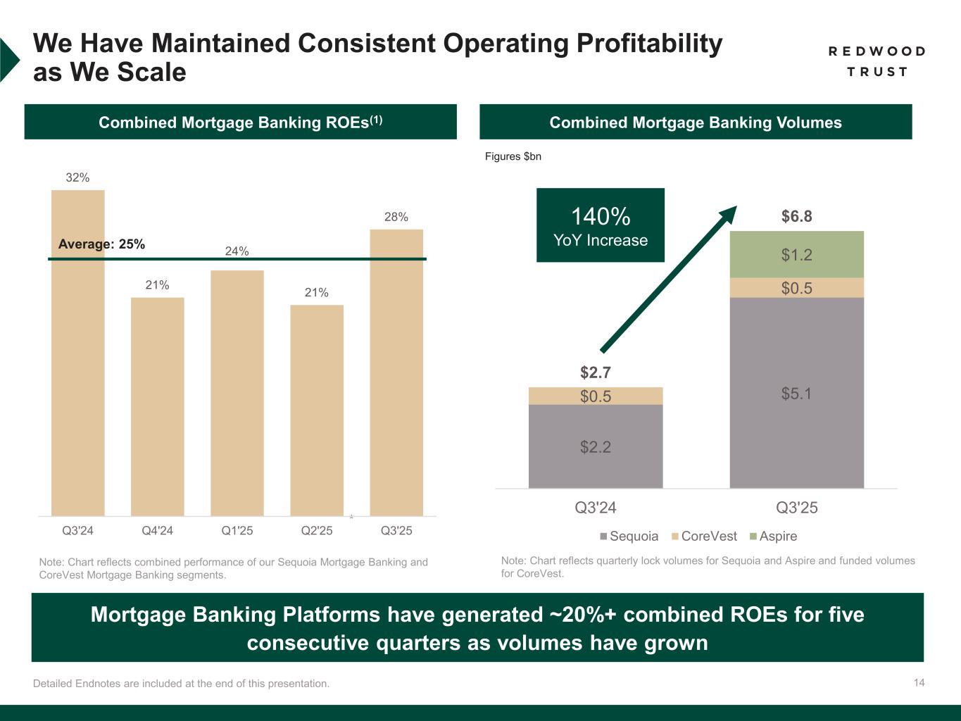 13 Third Quarter 2025 Financial Performance *Non-GAAP Core Segments EAD EPS and EAD ROE are non-GAAP measures. See “Non-GAAP Disclosures” slides in the Endnotes for additional information and reconciliation to GAAP metrics. Detailed Endnotes are included at the end of this presentation. Earnings and ROEs Book Value and Common Stock Dividend $(0.08) GAAP EPS $0.18 Dividend Per Share 12.4% Indicative Dividend Yield(2) (3.9)% GAAP ROE Segment Summary $7.35 Book Value Per Share 0.5% Total Economic Return(1) $1.6 bn Core Segments represent 75% of total capital $0.20 Non-GAAP Core Segments EAD EPS* 16.8% Non-GAAP Core Segments EAD ROE* Segment ROE(4)) Non-GAAP EAD ROE* Mortgage Banking (Combined) 28% 29% Redwood Investments 9% 10% Legacy Investments (18%) (12%) Core Segments (Mortgage Banking Platform Segments & Redwood Investments) Legacy Investments Legacy Investments 25% Mortgage Banking Platforms 47% Redwood Investments 28% Segment Capital Composition(3) Segment Returns