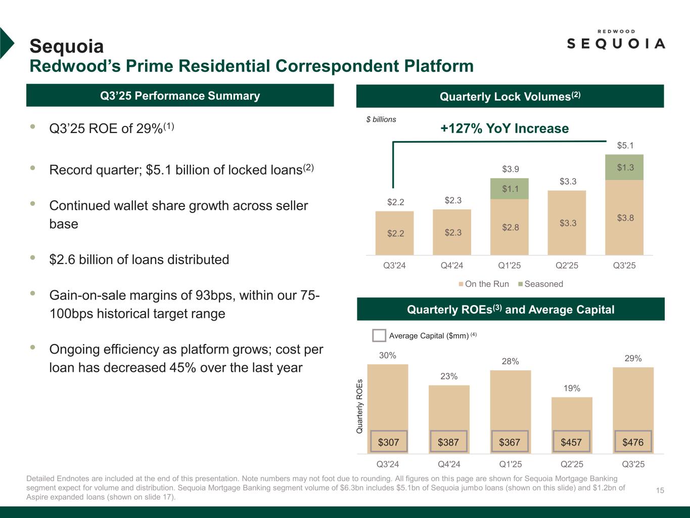 14 $2.2 $5.1$0.5 $0.5 $1.2 $2.7 $6.8 Q3'24 Q3'25 Sequoia CoreVest Aspire We Have Maintained Consistent Operating Profitability as We Scale Detailed Endnotes are included at the end of this presentation. Combined Mortgage Banking ROEs(1) Combined Mortgage Banking Volumes Figures $bn Mortgage Banking Platforms have generated ~20%+ combined ROEs for five consecutive quarters as volumes have grown 140% YoY Increase Note: Chart reflects quarterly lock volumes for Sequoia and Aspire and funded volumes for CoreVest. * 32% 21% 24% 21% 28% Q3'24 Q4'24 Q1'25 Q2'25 Q3'25 Note: Chart reflects combined performance of our Sequoia Mortgage Banking and CoreVest Mortgage Banking segments. Average: 25%