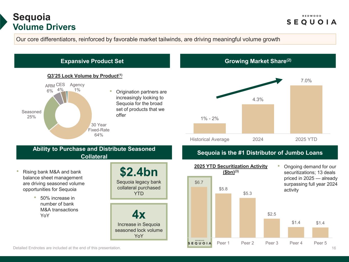 15 30% 23% 28% 19% 29% Q3'24 Q4'24 Q1'25 Q2'25 Q3'25 Detailed Endnotes are included at the end of this presentation. Note numbers may not foot due to rounding. All figures on this page are shown for Sequoia Mortgage Banking segment expect for volume and distribution. Sequoia Mortgage Banking segment volume of $6.3bn includes $5.1bn of Sequoia jumbo loans (shown on this slide) and $1.2bn of Aspire expanded loans (shown on slide 17). Sequoia Redwood’s Prime Residential Correspondent Platform Quarterly Lock Volumes(2) $ billions +127% YoY Increase Quarterly ROEs(3) and Average Capital Average Capital ($mm) (4) • Q3’25 ROE of 29%(1) • Record quarter; $5.1 billion of locked loans(2) • Continued wallet share growth across seller base • $2.6 billion of loans distributed • Gain-on-sale margins of 93bps, within our 75- 100bps historical target range • Ongoing efficiency as platform grows; cost per loan has decreased 45% over the last year $307 $387 $367 $457 $476 Q u a rt e rl y R O E s Q3’25 Performance Summary $2.2 $2.3 $2.8 $3.3 $3.8 $1.1 $1.3 $2.2 $2.3 $3.9 $3.3 $5.1 Q3'24 Q4'24 Q1'25 Q2'25 Q3'25 On the Run Seasoned