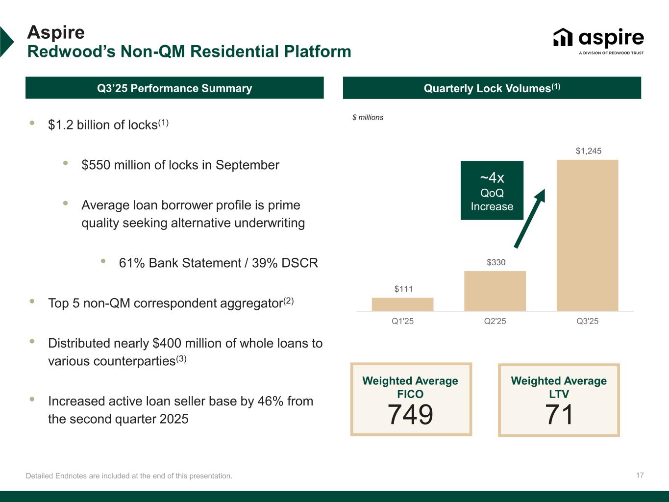 16 1% - 2% 4.3% 7.0% Historical Average 2024 2025 YTD Detailed Endnotes are included at the end of this presentation. Sequoia Volume Drivers Our core differentiators, reinforced by favorable market tailwinds, are driving meaningful volume growth Growing Market Share(2)Expansive Product Set Sequoia is the #1 Distributor of Jumbo Loans Ability to Purchase and Distribute Seasoned Collateral • Rising bank M&A and bank balance sheet management are driving seasoned volume opportunities for Sequoia • 50% increase in number of bank M&A transactions YoY $2.4bn Sequoia legacy bank collateral purchased YTD • Ongoing demand for our securitizations; 13 deals priced in 2025 — already surpassing full year 2024 activity 2025 YTD Securitization Activity ($bn)(3) Q3’25 Lock Volume by Product(1) • Origination partners are increasingly looking to Sequoia for the broad set of products that we offer 30 Year Fixed-Rate 64% Seasoned 25% ARM 6% CES 4% Agency 1% 4x Increase in Sequoia seasoned lock volume YoY $6.7 $5.8 $5.3 $2.5 $1.4 $1.4 Peer 1 Peer 2 Peer 3 Peer 4 Peer 5