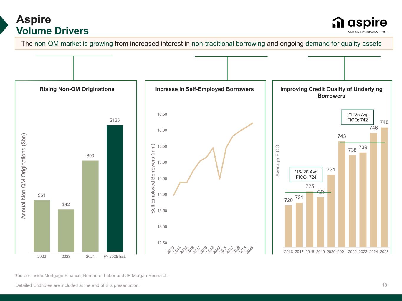 17 $111 $330 $1,245 Q1'25 Q2'25 Q3'25 Aspire Redwood’s Non-QM Residential Platform Detailed Endnotes are included at the end of this presentation. Quarterly Lock Volumes(1) ~4x QoQ Increase Weighted Average LTV 71 Weighted Average FICO 749 $ millions Q3’25 Performance Summary • $1.2 billion of locks(1) • $550 million of locks in September • Average loan borrower profile is prime quality seeking alternative underwriting • 61% Bank Statement / 39% DSCR • Top 5 non-QM correspondent aggregator(2) • Distributed nearly $400 million of whole loans to various counterparties(3) • Increased active loan seller base by 46% from the second quarter 2025