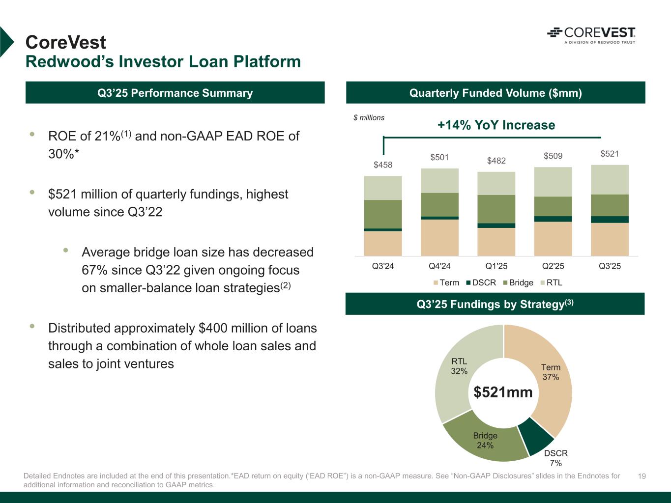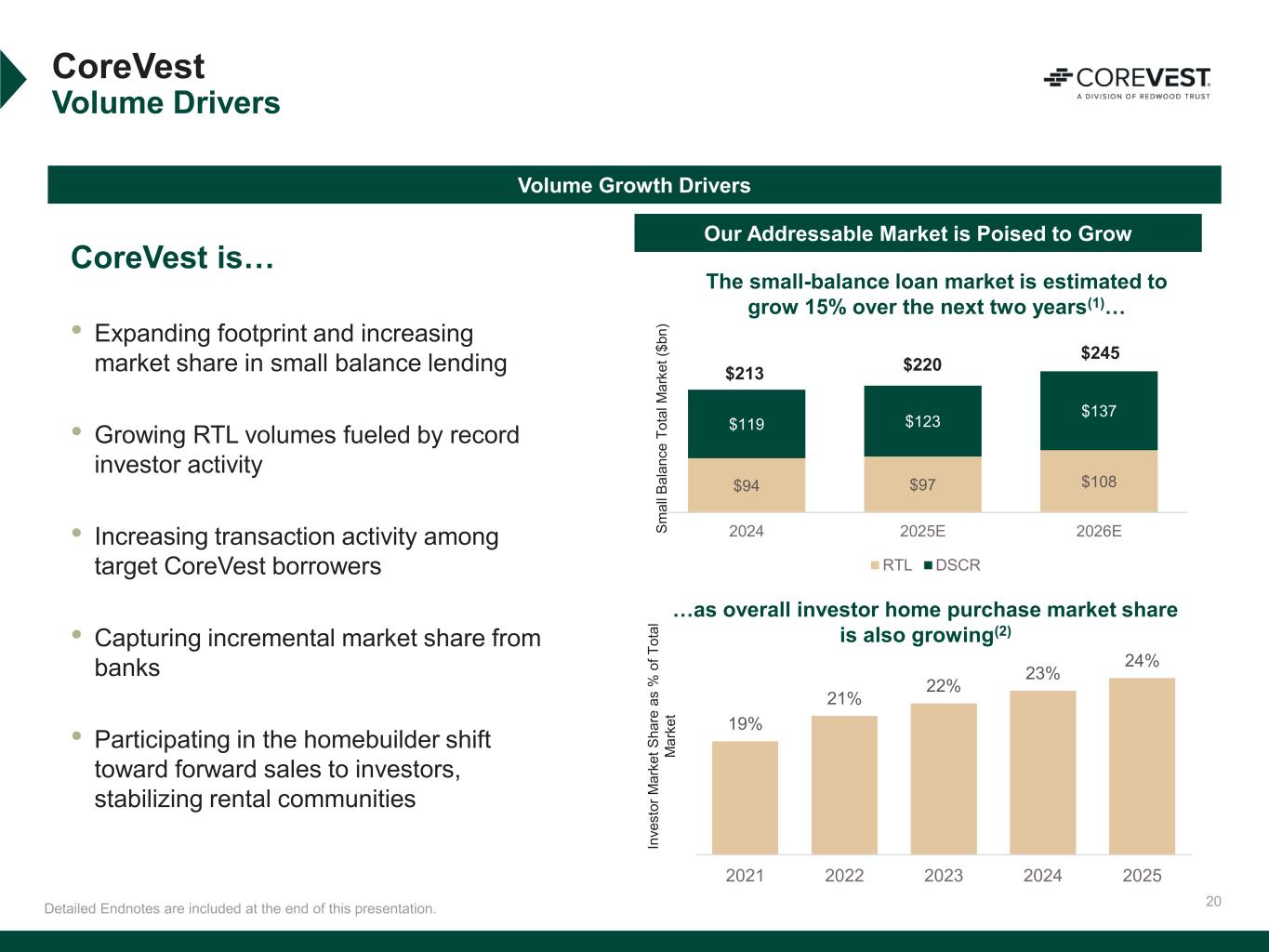 19 $458 $501 $482 $509 $521 Q3'24 Q4'24 Q1'25 Q2'25 Q3'25 Term DSCR Bridge RTL Term 37% DSCR 7% Bridge 24% RTL 32% CoreVest Redwood’s Investor Loan Platform Quarterly Funded Volume ($mm) Detailed Endnotes are included at the end of this presentation.*EAD return on equity (‘EAD ROE”) is a non-GAAP measure. See “Non-GAAP Disclosures” slides in the Endnotes for additional information and reconciliation to GAAP metrics. +14% YoY Increase $ millions Q3’25 Fundings by Strategy(3) $521mm • ROE of 21%(1) and non-GAAP EAD ROE of 30%* • $521 million of quarterly fundings, highest volume since Q3’22 • Average bridge loan size has decreased 67% since Q3’22 given ongoing focus on smaller-balance loan strategies(2) • Distributed approximately $400 million of loans through a combination of whole loan sales and sales to joint ventures Q3’25 Performance Summary