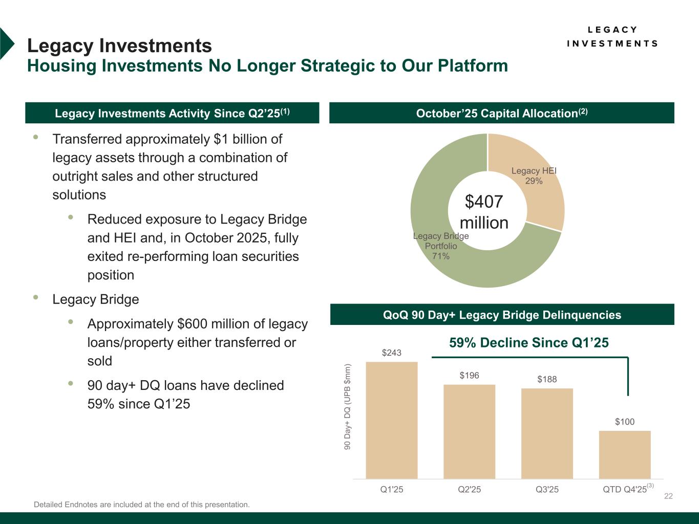 21 Redwood Investments Housing Investments Sourced from Our Operating Platforms Q3’25 Performance Update ▪ ROE of 9%(1) and non-GAAP EAD ROE of 10%* ▪ Deployed $30 million of capital towards investments created from mortgage-banking activities ▪ Completed accretive non-recourse financing structure that unlocked $25 million of capital ▪ Ongoing focus on: ▪ Optimizing non-recourse financing structures to improve returns ▪ Retaining investments created from our mortgage banking platforms $441 million Q3’25 Capital Allocation(2) Q2’25 QoQ 90 Day+ Delinquencies (% UPB) Q3’25 Detailed Endnotes are included at the end of this presentation.*EAD return on equity (“EAD ROE”) is a non-GAAP measure. See “Non-GAAP Disclosures” slides in the Endnotes for additional information and reconciliation to GAAP metrics. Capital allocated to mortgage banking platforms is inclusive of risk-based capital. Q1’25 Servicing Investments 23% Sequoia Securities Retained 26% Term Securities Retained 16% Bridge Securities Retained 35% 0.2% 8.4% 3.8% 0.3% 7.1% 3.6% 0.3% 7.7% 2.9% Sequoia Securities Retained Term Securities Retained Bridge Securities Retained