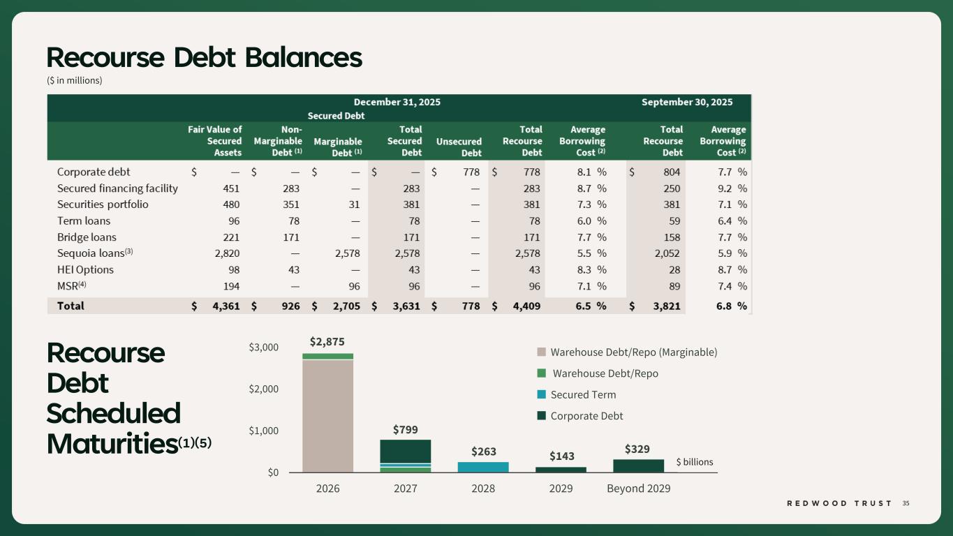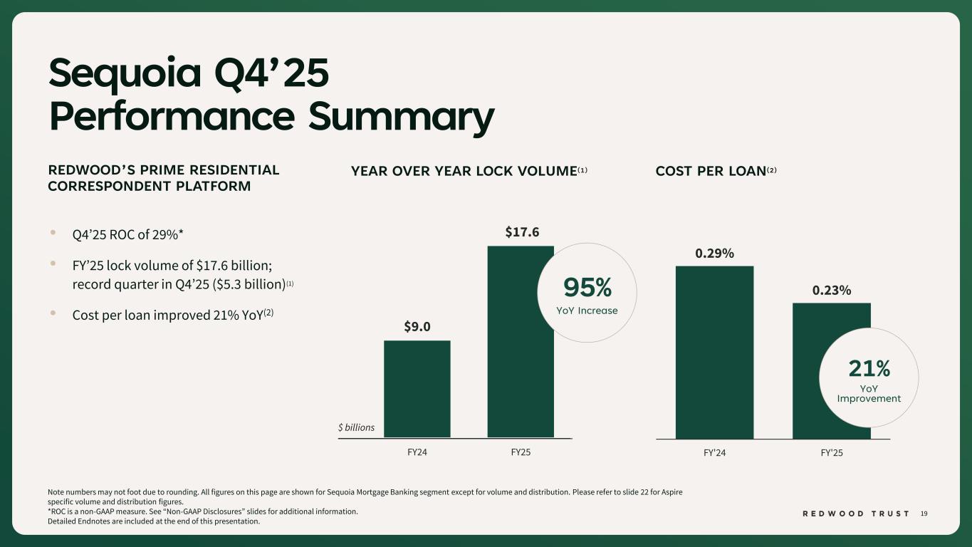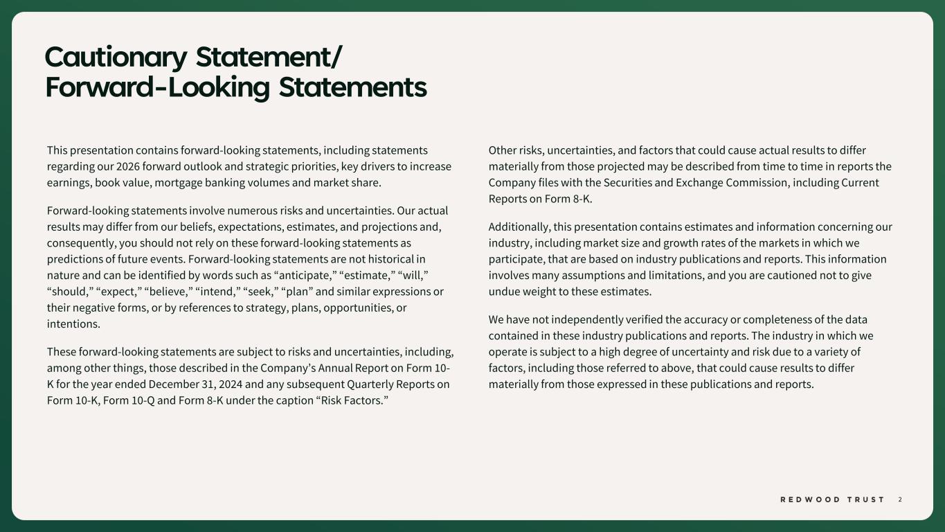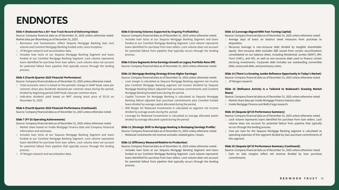 42 ENDNOTES Slide 4 (Redwood Has a 30+ Year Track Record of Delivering Value) Source: Company financial data as of December 31, 2025 unless otherwise noted. Market data per Bloomberg as of December 31, 2025. 1. Borrowers and homeowners reflect Sequoia Mortgage Banking loan lock volume and CoreVest Mortgage Banking funded units, since inception. 2. JP Morgan research and securitization data. 3. Includes loan locks at our Sequoia Mortgage Banking Segment and loans funded at our CoreVest Mortgage Banking Segment. Lock volume represents loans identified for purchase from loan sellers. Lock volume does not account for potential fallout from pipeline that typically occurs through the lending process. Slide 5 (Fourth Quarter 2025 Financial Performance) Source: Company financial data as of December 31, 2025 unless otherwise noted. 1. Total economic return is based on the periodic change in GAAP book value per common share plus dividends declared per common share during the period, divided by beginning period GAAP book value per common share. 2. Indicative dividend yield based on RWT closing stock price of $5.53 on December 31, 2025. Slide 6 (Fourth Quarter 2025 Financial Performance (Continued)) Source: Company financial data as of December 31, 2025 unless otherwise noted. Slide 7 (FY‘25 Operating Achievements) Source: Company financial data as of December 31, 2025 unless otherwise noted. 1. Market share based on Inside Mortgage Finance data and Company historical information and estimates. 2. Includes loan locks at our Sequoia Mortgage Banking Segment and loans funded at our CoreVest Mortgage Banking Segment. Lock volume represents loans identified for purchase from loan sellers. Lock volume does not account for potential fallout from pipeline that typically occurs through the lending process. 3. JP Morgan research and securitization data. Slide 8 (Growing Volumes Supported by Ongoing Profitability) Source: Company financial data as of December 31, 2025 unless otherwise noted. 1. Includes loan locks at our Sequoia Mortgage Banking Segment and loans funded at our CoreVest Mortgage Banking Segment. Lock volume represents loans identified for purchase from loan sellers. Lock volume does not account for potential fallout from pipeline that typically occurs through the lending process. Slide 9 (Core Segments Drive Earnings Growth as Legacy Portfolio Runs Off) Source: Company financial data as of December 31, 2025 unless otherwise noted. Slide 10 (Mortgage Banking Strategy Drives Higher Earnings) Source: Company financial data as of December 31, 2025 unless otherwise noted. 1. Loan margin is calculated as Sequoia Mortgage Banking segment net income plus CoreVest Mortgage Banking segment net income dividend by Sequoia Mortgage Banking fallout adjusted loan purchase commitments and CoreVest Mortgage Banking funded loans during the period. 2. Capital Turnover for Mortgage Banking is calculated as Sequoia Mortgage Banking fallout adjusted loan purchase commitments plus CoreVest funded loans divided by average capital allocated during the period. 3. NIM Margin for Redwood Investments is calculated as segment net income divided by average assets during the period. 4. Leverage for Redwood Investments is calculated as average allocated assets divided by average allocated capital during the period. Slide 11 (Strategic Shift to Mortgage Banking is Reshaping Earnings Profile) Source: Company financial data as of December 31, 2025 unless otherwise noted. 1. Redwood Investments net revenue excludes realized gains / losses. Slide 12 (Efficiency Measured Relative to Production) Source: Company financial data as of December 31, 2025 unless otherwise noted. 1. Includes loan locks at our Sequoia Mortgage Banking Segment and loans funded at our CoreVest Mortgage Banking Segment. Lock volume represents loans identified for purchase from loan sellers. Lock volume does not account for potential fallout from pipeline that typically occurs through the lending process. Slide 13 (Leverage Aligned With Fast-Turning Capital) Source: Company financial data as of December 31, 2025 unless otherwise noted. 1. Average days of loans on balance sheet measures from purchase to disposition. 2. Recourse leverage is non-recourse debt divided by tangible shareholder equity. Non-recourse debt excludes ABS issued from certain securitizations consolidated on our balance sheet, including Residential Jumbo (SEMT), BPL Term (CAFL), and HEI, as well as non-recourse debt used to finance certain servicing investments. Corporate debt includes our outstanding convertible debt, unsecured debt, and promissory notes. Slide 14 (There’s a Growing Jumbo Refinance Opportunity in Today’s Market) Source: Company financial data as of December 31, 2025 unless otherwise noted. 1. JP Morgan research. Slide 15 (Refinance Activity Is a Tailwind to Redwood’s Growing Market Share) Source: Company financial data as of December 31, 2025 unless otherwise noted. 1. Market share data per Inside Mortgage Finance industry data. 2. Inside Mortgage Finance and Wells Fargo research. Slide 19 (Sequoia Q4’25 Performance Summary) Source: Company financial data as of December 31, 2025 unless otherwise noted. 1. Lock volume represents loans identified for purchase from loan sellers. Lock volume does not account for potential fallout from pipeline that typically occurs through the lending process. 2. Cost per loan for the Sequoia Mortgage Banking segment is calculated as operating expenses of this segment divided by loan purchase commitments of this segment. Slide 20 (Sequoia Q4’25 Performance Summary (Continued)) Source: Company financial data as of December 31, 2025 unless otherwise noted. 1. Gain on Sale margins reflect net revenue divided by loan purchase commitments.