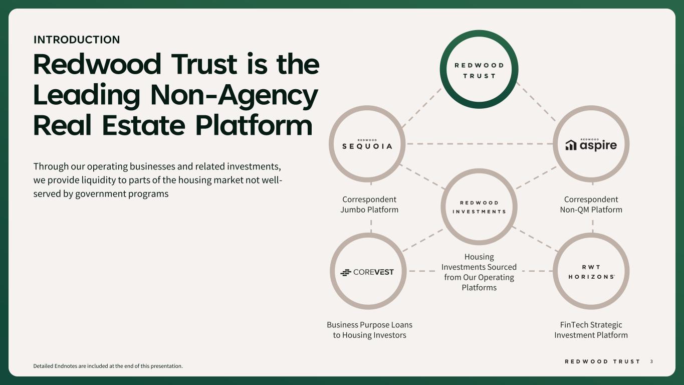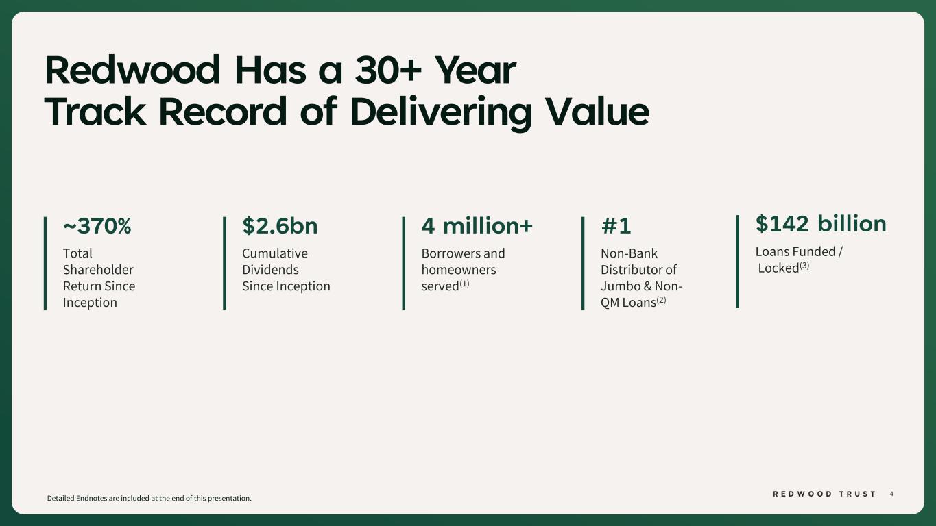 3 Redwood Trust is the Leading Non-Agency Real Estate Platform INTRODUCTION Detailed Endnotes are included at the end of this presentation. Correspondent Non-QM Platform Correspondent Jumbo Platform FinTech Strategic Investment Platform Business Purpose Loans to Housing Investors Housing Investments Sourced from Our Operating Platforms Through our operating businesses and related investments, we provide liquidity to parts of the housing market not well- served by government programs
