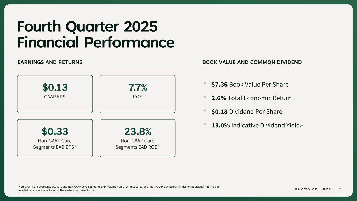 4 Redwood Has a 30+ Year Track Record of Delivering Value Detailed Endnotes are included at the end of this presentation. ~370% Total Shareholder Return Since Inception $2.6bn Cumulative Dividends Since Inception 4 million+ Borrowers and homeowners served(1) #1 Non-Bank Distributor of Jumbo & Non- QM Loans(2) $142 billion Loans Funded / Locked(3)