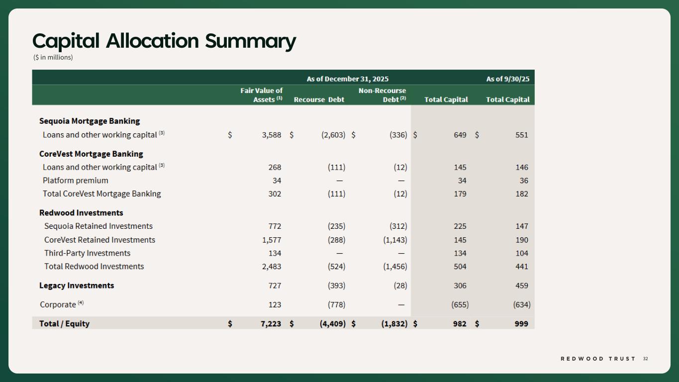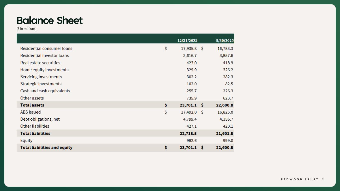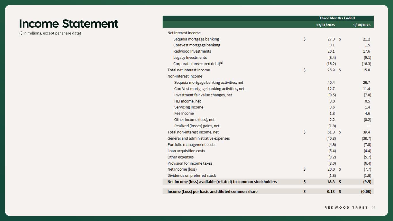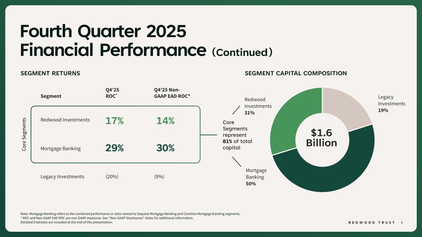 40 $ in millions Non-GAAP Disclosures (Continued) Footnotes: 1. Certain totals may not foot due to rounding. 2. Earnings Available for Distribution (“EAD”) is a non-GAAP measure that the Company has historically reported and continues to use to present management’s non-GAAP analysis of the operating performance of the Company’s different business segments. EAD is defined, as GAAP net income (loss) available (related) to common stockholders, adjusted to (i) exclude investment fair value changes, net; (ii) exclude realized gains and losses; (iii) exclude acquisition-related expenses; (iv) exclude certain organizational restructuring charges, as applicable; and (v) reflect a hypothetical income tax adjustment associated with these items. 3. Core Segments EAD and Core Segments EAD ROE are non-GAAP measures and are used to present management’s non-GAAP analysis of the combined performance of the Company’s mortgage banking platforms and related investments (which are defined as the "Core Segments" and which consist of the Company’s Sequoia Mortgage Banking, CoreVest Mortgage Banking and Redwood Investments Segments), inclusive of an allocated portion of the Company’s Corporate segment relating to those Core Segments. Core Segments EAD excludes the Company’s Legacy Investments segment and excludes an allocated portion of the Company’s Corporate segment relating to the Legacy Investments segment. Core Segments EAD is defined as: GAAP net income (loss) available (related) to common stockholders adjusted to (i) exclude GAAP net loss from the Legacy Investments Segment, (ii) exclude the portion of the Corporate Segment allocation relating to the Legacy Investments segment, (iii) exclude investment fair value changes, net; (iv) exclude realized gains and losses; (v) exclude acquisition related expenses; (vi) exclude certain organizational restructuring charges (as applicable); and (vii) adjust for the hypothetical income taxes associated with these adjustments. Refer to footnote 11 below for the definition of Core Segments EAD ROE. 4. Investment fair value changes, net includes all amounts within that same line item in our consolidated statements of (loss) income that are attributable to each segment, which primarily represents both realized and unrealized gains and losses on our investments held in each segment and associated hedges. Realized and unrealized gains and losses on our HEI investments are reflected in a separate line item on our consolidated income statements titled "HEI income, net". 5. Realized (gains)/losses, net includes all amounts within that line item on our consolidated statements of (loss) income that are attributable to each segment. 6. Acquisition related expenses include transaction costs paid to third parties, as applicable, and the ongoing amortization of intangible assets related to the Riverbend and CoreVest acquisitions. 7. Tax effect of adjustments represents the hypothetical income taxes associated with EAD adjustments used to calculate each segment EAD. 8. Allocation of Corporate Segment is based on the average capital utilized by the segment during the period, which represents management’s internal estimate of the average economic capital allocated to support the activities of each segment. 9. Core Segments EAD per basic common share is a non-GAAP measure and is defined as Core Segments EAD divided by basic weighted average common shares outstanding at the end of the period. 10. ROE consists of consolidated GAAP net income annualized divided by average common equity for the period. 11. Core Segments EAD ROE is a non-GAAP measure and is defined as Core Segments EAD annualized divided by average capital utilized by the Core Segments of $726 million and $643 million for the three months ended December 31, 2025 and September 30, 2025, respectively. Average capital utilized is management's internal estimate of the average economic capital allocated to support the activities of the Core Segments.