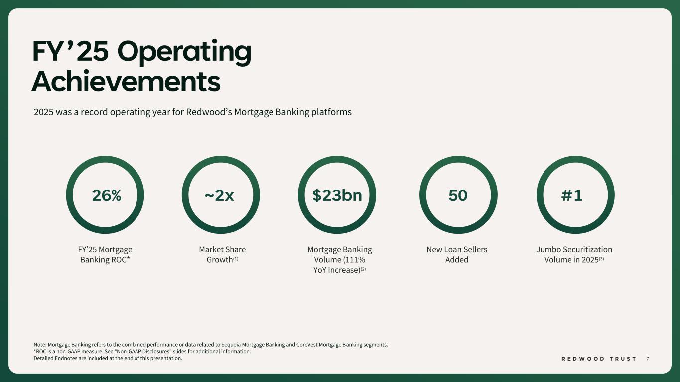 6 Fourth Quarter 2025 Financial Performance (Continued) Note: Mortgage Banking refers to the combined performance or data related to Sequoia Mortgage Banking and CoreVest Mortgage Banking segments. * ROC and Non-GAAP EAD ROC are non-GAAP measures. See “Non-GAAP Disclosures” slides for additional information. Detailed Endnotes are included at the end of this presentation. SEGMENT RETURNS Legacy Investments 19% Mortgage Banking 50% Redwood Investments 31% SEGMENT CAPITAL COMPOSITION Core Segments represent 81% of total capital Segment Q4’25 ROC*) Q4’25 Non- GAAP EAD ROC* Redwood Investments Mortgage Banking Legacy Investments (20%) (9%) 17% 14% 29% 30%C o re S eg m e n ts $1.6 Billion