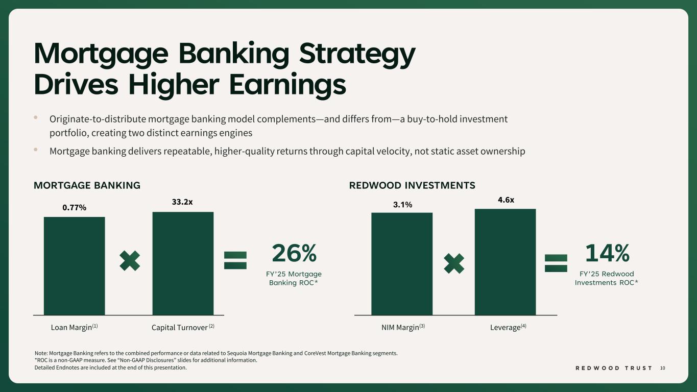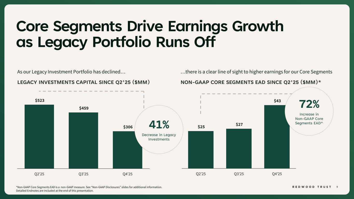 8 Note: Mortgage Banking refers to the combined performance or data related to Sequoia Mortgage Banking and CoreVest Mortgage Banking segments. *ROC is a non-GAAP measure. See “Non-GAAP Disclosures” slides for additional information. Growing Volumes Supported by Ongoing Profitability 24% 21% 28% 29% Q1'25 Q2'25 Q3'25 Q4'25 MORTGAGE BANKING ROCs* $10.7 $22.7 FY'24 FY'25 Sequoia (Locks) CoreVest (Funded) Aspire (Locks) 111% YoY Increase MORTGAGE BANKING VOLUMES(1) 26% FY’26 ROC*