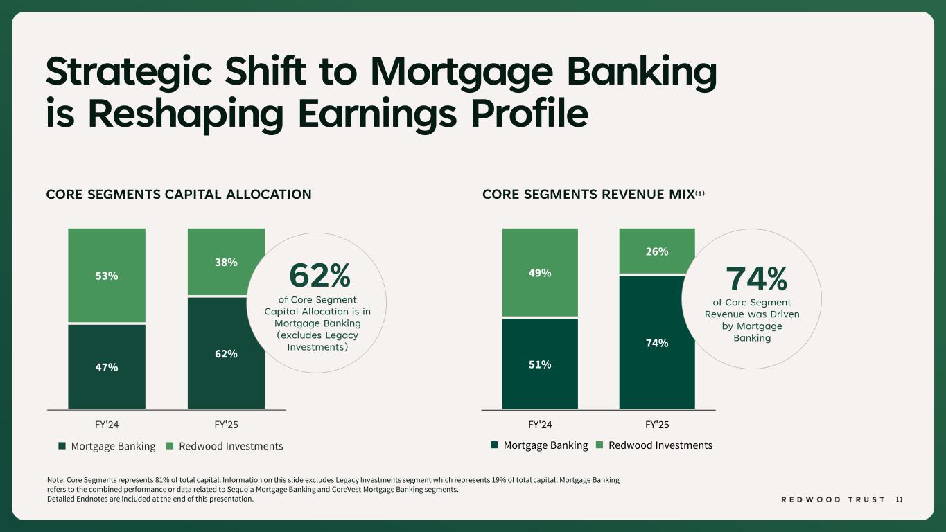 10 33.2x Mortgage Banking Strategy Drives Higher Earnings Detailed Endnotes are included at the end of this presentation. Capital Turnover (2) 0.77% Loan Margin(1) 26% 3.1% 4.6x Leverage(4)NIM Margin(3) MORTGAGE BANKING REDWOOD INVESTMENTS Note: Mortgage Banking refers to the combined performance or data related to Sequoia Mortgage Banking and CoreVest Mortgage Banking segments. *ROC is a non-GAAP measure. See “Non-GAAP Disclosures” slides for additional information. • Originate-to-distribute mortgage banking model complements—and differs from—a buy-to-hold investment portfolio, creating two distinct earnings engines • Mortgage banking delivers repeatable, higher-quality returns through capital velocity, not static asset ownership FY’25 Mortgage Banking ROC* 14% FY’25 Redwood Investments ROC*