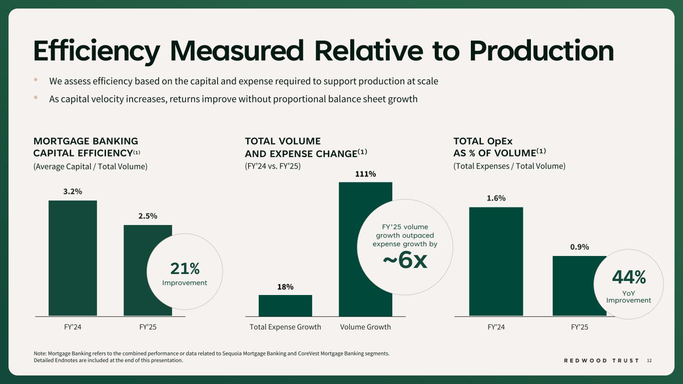 11 47% 62% 53% 38% FY'24 FY'25 Mortgage Banking Redwood Investments Strategic Shift to Mortgage Banking is Reshaping Earnings Profile Note: Core Segments represents 81% of total capital. Information on this slide excludes Legacy Investments segment which represents 19% of total capital. Mortgage Banking refers to the combined performance or data related to Sequoia Mortgage Banking and CoreVest Mortgage Banking segments. Detailed Endnotes are included at the end of this presentation. CORE SEGMENTS CAPITAL ALLOCATION 51% 74% 49% 26% FY'24 FY'25 Mortgage Banking Redwood Investments CORE SEGMENTS REVENUE MIX(1) of Core Segment Capital Allocation is in Mortgage Banking (excludes Legacy Investments) 62% of Core Segment Revenue was Driven by Mortgage Banking 74%