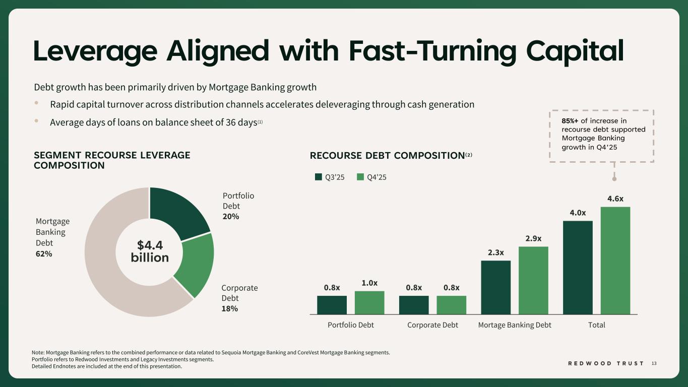12 3.2% 2.5% FY'24 FY'25 Note: Mortgage Banking refers to the combined performance or data related to Sequoia Mortgage Banking and CoreVest Mortgage Banking segments. Detailed Endnotes are included at the end of this presentation. 21% Improvement TOTAL VOLUME AND EXPENSE CHANGE(1) (FY’24 vs. FY’25) MORTGAGE BANKING CAPITAL EFFICIENCY(1) (Average Capital / Total Volume) Efficiency Measured Relative to Production TOTAL OpEx AS % OF VOLUME(1) (Total Expenses / Total Volume) 1.6% 0.9% FY'24 FY'25 • We assess efficiency based on the capital and expense required to support production at scale • As capital velocity increases, returns improve without proportional balance sheet growth 44% YoY Improvement 18% 111% Total Expense Growth Volume Growth FY’25 volume growth outpaced expense growth by~6x