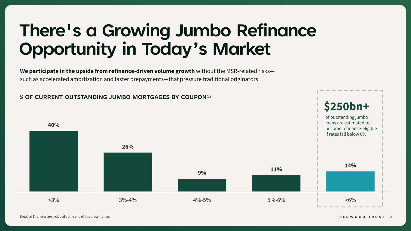 13 Portfoli o Debt 20% Corporate Debt 18% Mortgage Banking Debt 62% Leverage Aligned with Fast-Turning Capital Note: Mortgage Banking refers to the combined performance or data related to Sequoia Mortgage Banking and CoreVest Mortgage Banking segments. Portfolio refers to Redwood Investments and Legacy Investments segments. Detailed Endnotes are included at the end of this presentation. SEGMENT RECOURSE LEVERAGE COMPOSITION Debt growth has been primarily driven by Mortgage Banking growth • Rapid capital turnover across distribution channels accelerates deleveraging through cash generation • Average days of loans on balance sheet of 36 days(1) RECOURSE DEBT COMPOSITION(2) 0.8x 0.8x 2.3x 4.0x 1.0x 0.8x 2.9x 4.6x Portfolio Debt Corporate Debt Mortage Banking Debt Total Q3'25 Q4'25 $4.4 billion Portfolio Debt Corporate Debt 18% 85%+ of increase in recourse debt supported Mortgage Banking growth in Q4’25