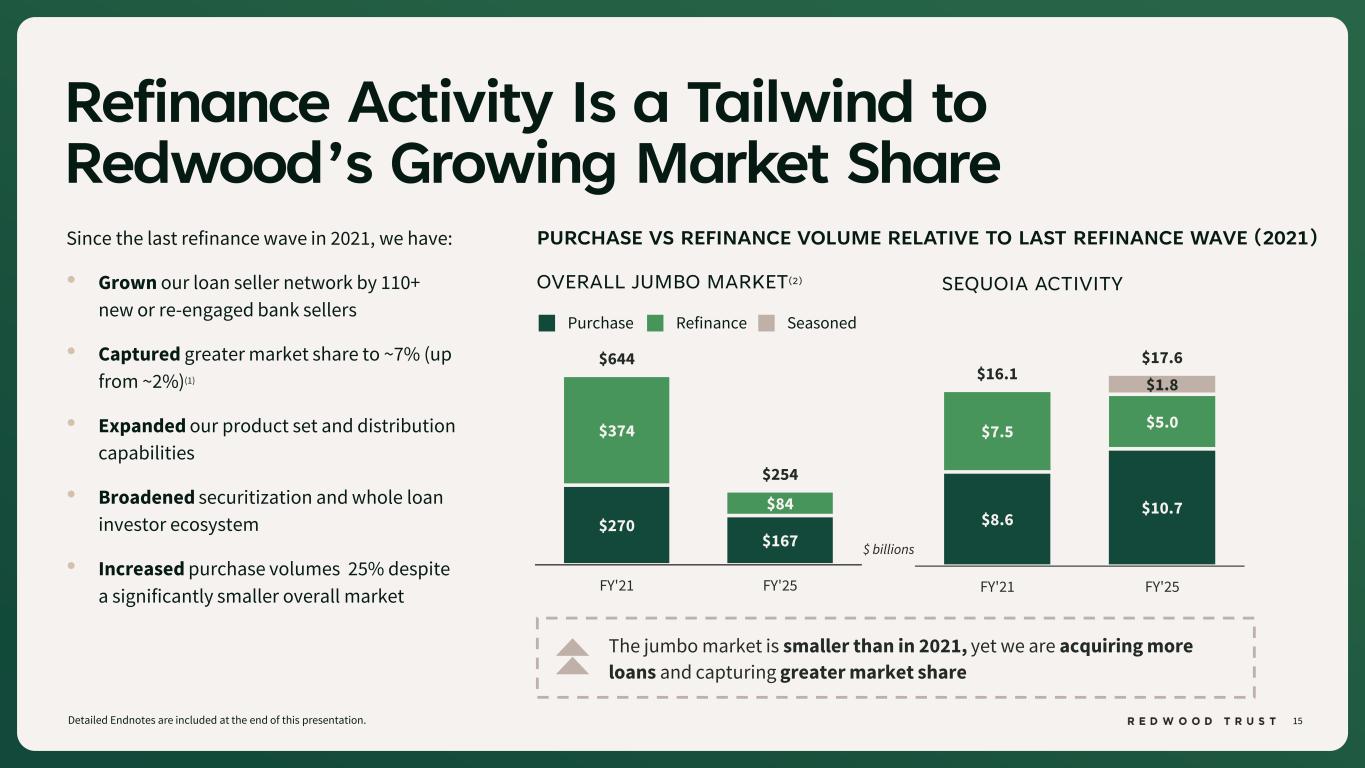 14 There's a Growing Jumbo Refinance Opportunity in Today’s Market Detailed Endnotes are included at the end of this presentation. % OF CURRENT OUTSTANDING JUMBO MORTGAGES BY COUPON(1) We participate in the upside from refinance-driven volume growth without the MSR-related risks— such as accelerated amortization and faster prepayments—that pressure traditional originators 40% 26% 9% 11% 14% <3% 3%-4% 4%-5% 5%-6% >6% $250bn+ of outstanding jumbo loans are estimated to become refinance-eligible if rates fall below 6%