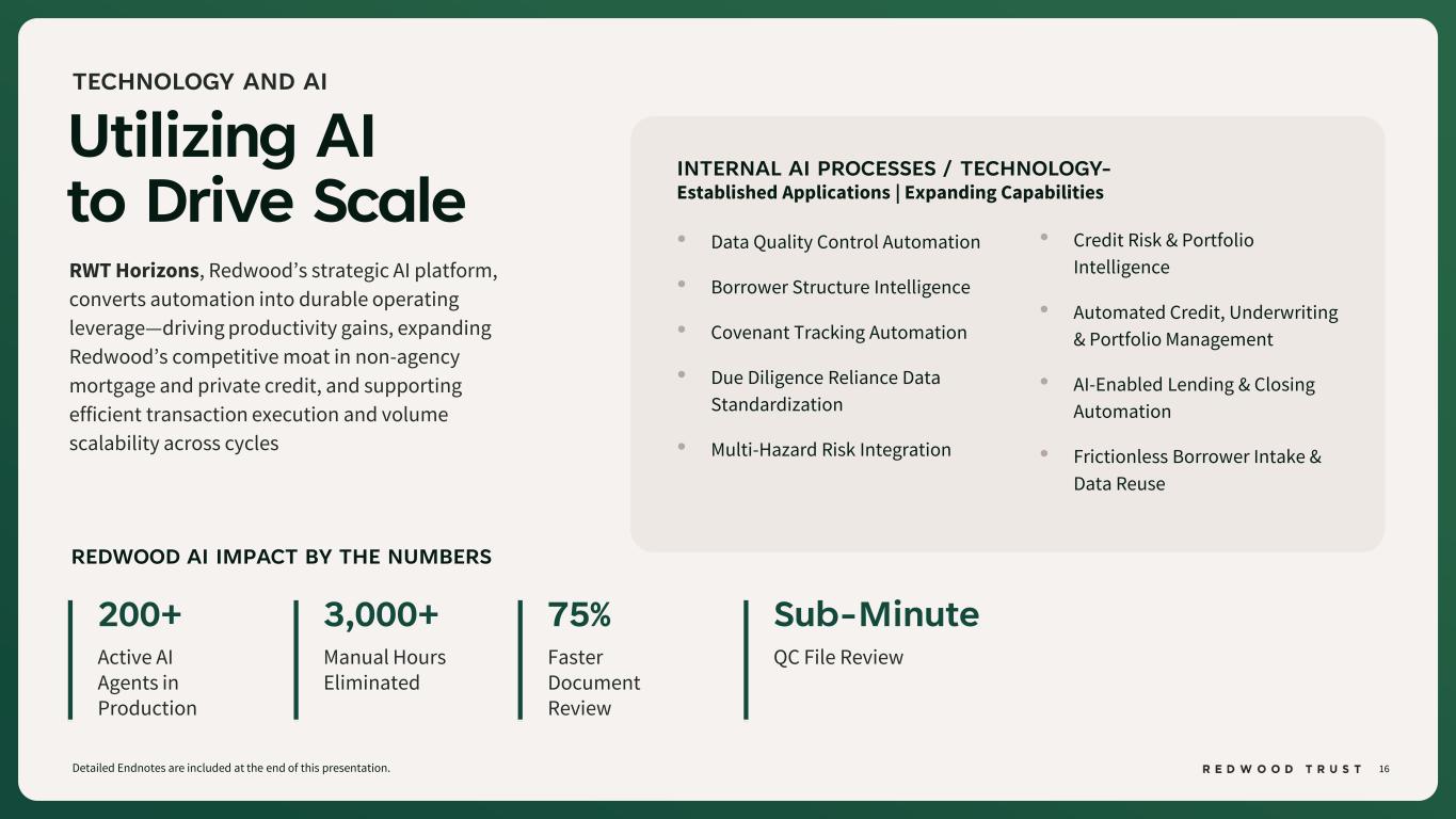 15 $8.6 $10.7 $7.5 $5.0 $1.8 $16.1 $17.6 FY'21 FY'25 Refinance Activity Is a Tailwind to Redwood’s Growing Market Share PURCHASE VS REFINANCE VOLUME RELATIVE TO LAST REFINANCE WAVE (2021) Since the last refinance wave in 2021, we have: • Grown our loan seller network by 110+ new or re-engaged bank sellers • Captured greater market share to ~7% (up from ~2%)(1) • Expanded our product set and distribution capabilities • Broadened securitization and whole loan investor ecosystem • Increased purchase volumes 25% despite a significantly smaller overall market Detailed Endnotes are included at the end of this presentation. $ billions OVERALL JUMBO MARKET(2) SEQUOIA ACTIVITY The jumbo market is smaller than in 2021, yet we are acquiring more loans and capturing greater market share $270 $167 $374 $84 $644 $254 FY'21 FY'25 Purchase Refinance Seasoned