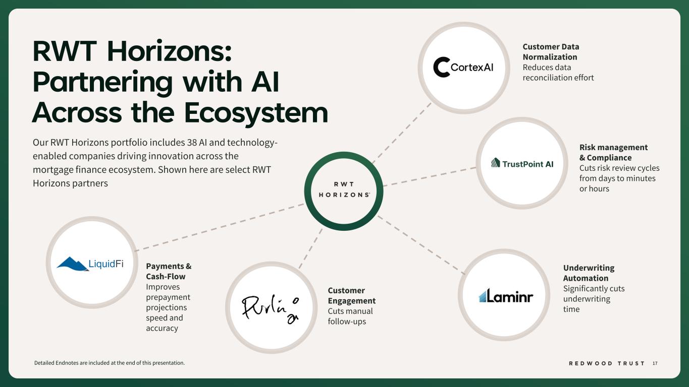 16 Utilizing AI to Drive Scale Detailed Endnotes are included at the end of this presentation. RWT Horizons, Redwood’s strategic AI platform, converts automation into durable operating leverage—driving productivity gains, expanding Redwood’s competitive moat in non-agency mortgage and private credit, and supporting efficient transaction execution and volume scalability across cycles • Data Quality Control Automation • Borrower Structure Intelligence • Covenant Tracking Automation • Due Diligence Reliance Data Standardization • Multi-Hazard Risk Integration • Credit Risk & Portfolio Intelligence • Automated Credit, Underwriting & Portfolio Management • AI-Enabled Lending & Closing Automation • Frictionless Borrower Intake & Data Reuse REDWOOD AI IMPACT BY THE NUMBERS INTERNAL AI PROCESSES / TECHNOLOGY- Established Applications | Expanding Capabilities 200+ Active AI Agents in Production 3,000+ Manual Hours Eliminated 75% Faster Document Review Sub-Minute QC File Review TECHNOLOGY AND AI