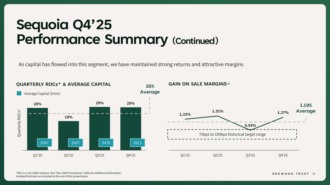 19 0.29% 0.23% FY'24 FY'25 $9.0 $17.6 FY24 FY25 Sequoia Q4’25 Performance Summary Note numbers may not foot due to rounding. All figures on this page are shown for Sequoia Mortgage Banking segment except for volume and distribution. Please refer to slide 22 for Aspire specific volume and distribution figures. *ROC is a non-GAAP measure. See “Non-GAAP Disclosures” slides for additional information. Detailed Endnotes are included at the end of this presentation. • Q4’25 ROC of 29%* • FY’25 lock volume of $17.6 billion; record quarter in Q4’25 ($5.3 billion)(1) • Cost per loan improved 21% YoY(2) YEAR OVER YEAR LOCK VOLUME(1)REDWOOD’S PRIME RESIDENTIAL CORRESPONDENT PLATFORM 95% YoY Increase COST PER LOAN(2) 21% YoY Improvement $ billions