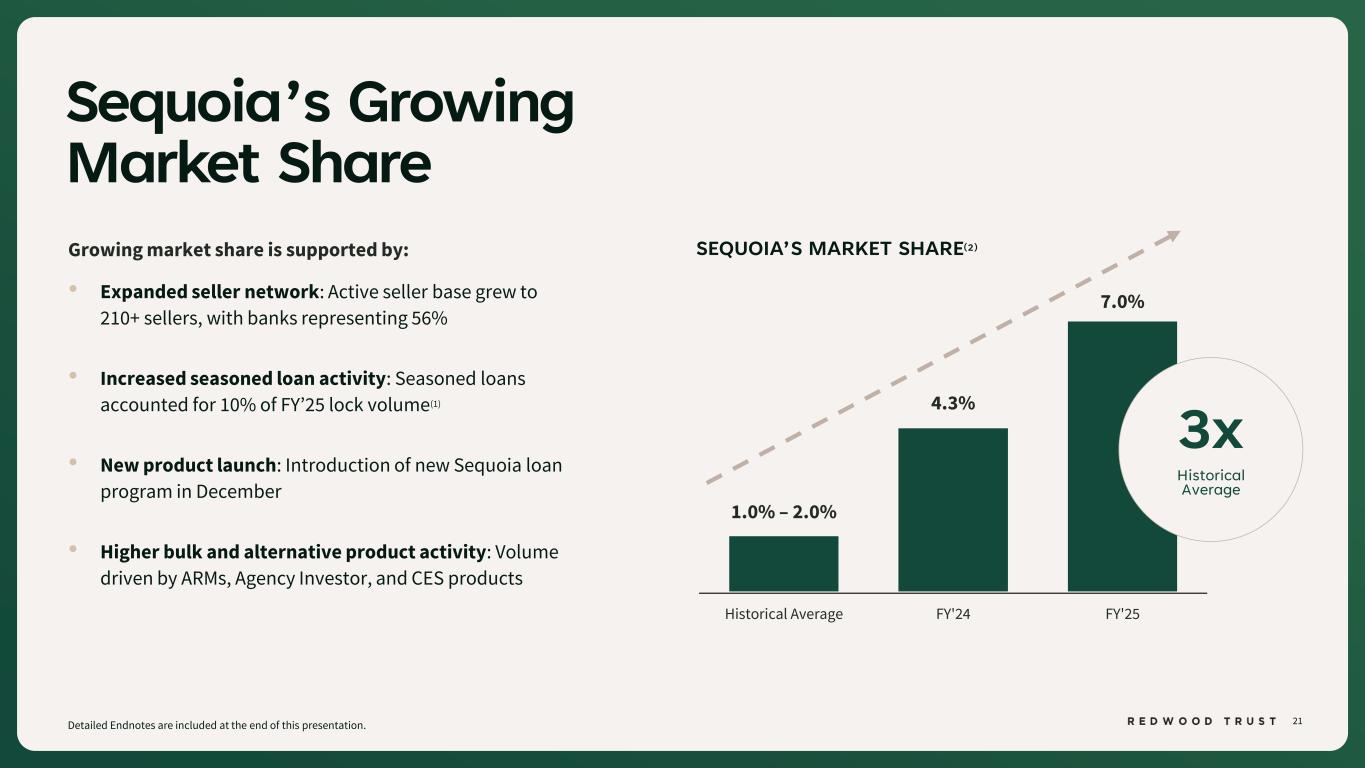 20 1.23% 1.31% 0.93% 1.27% Q1'25 Q2'25 Q3'25 Q4'25 28% 19% 29% 29% Q1'25 Q2'25 Q3'25 Q4'25 Q u a rt e rl y R O C s Sequoia Q4’25 Performance Summary (Continued) *ROC is a non-GAAP measure. See “Non-GAAP Disclosures” slides for additional information. Detailed Endnotes are included at the end of this presentation. QUARTERLY ROCs* & AVERAGE CAPITAL GAIN ON SALE MARGINS(1) As capital has flowed into this segment, we have maintained strong returns and attractive margins Average Capital ($mm) $476 26% Average 1.19% Average 75bps to 100bps historical target range * $613$457$367