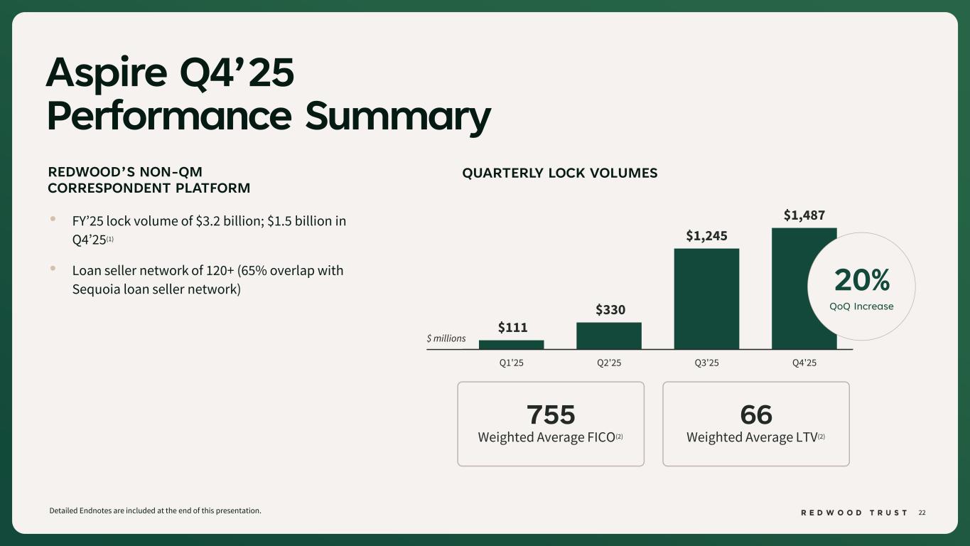 21 Sequoia’s Growing Market Share Detailed Endnotes are included at the end of this presentation. SEQUOIA’S MARKET SHARE(2) 1.0% – 2.0% 4.3% 7.0% Historical Average FY'24 FY'25 3x Historical Average Growing market share is supported by: • Expanded seller network: Active seller base grew to 210+ sellers, with banks representing 56% • Increased seasoned loan activity: Seasoned loans accounted for 10% of FY’25 lock volume(1) • New product launch: Introduction of new Sequoia loan program in December • Higher bulk and alternative product activity: Volume driven by ARMs, Agency Investor, and CES products