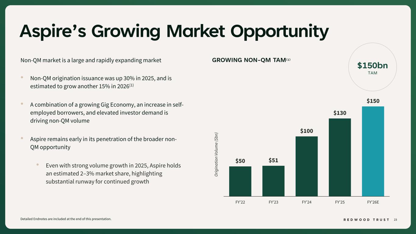 22 Aspire Q4’25 Performance Summary Detailed Endnotes are included at the end of this presentation. $111 $330 $1,245 $1,487 Q1'25 Q2'25 Q3'25 Q4'25 • FY’25 lock volume of $3.2 billion; $1.5 billion in Q4’25(1) • Loan seller network of 120+ (65% overlap with Sequoia loan seller network) 20% QoQ Increase QUARTERLY LOCK VOLUMESREDWOOD’S NON-QM CORRESPONDENT PLATFORM 755 Weighted Average FICO(2) 66 Weighted Average LTV(2) $ millions