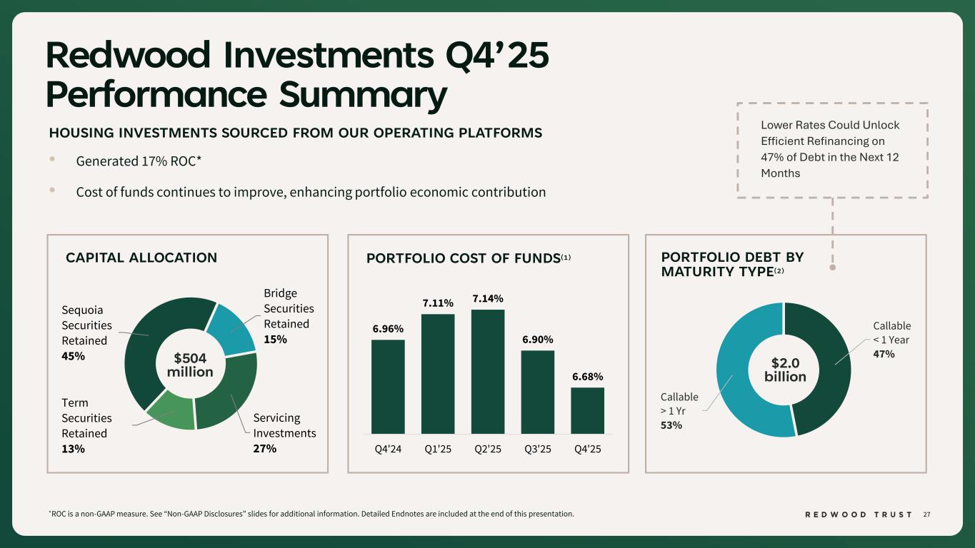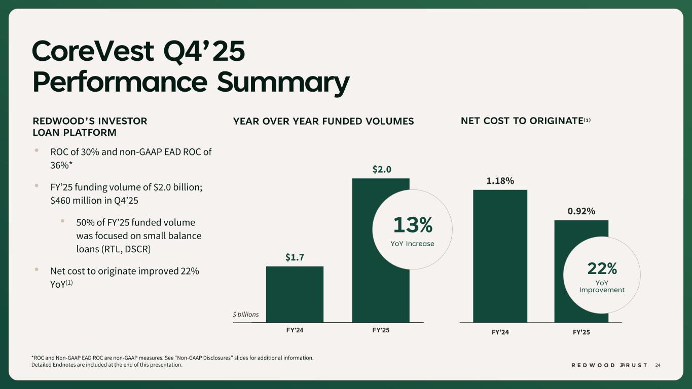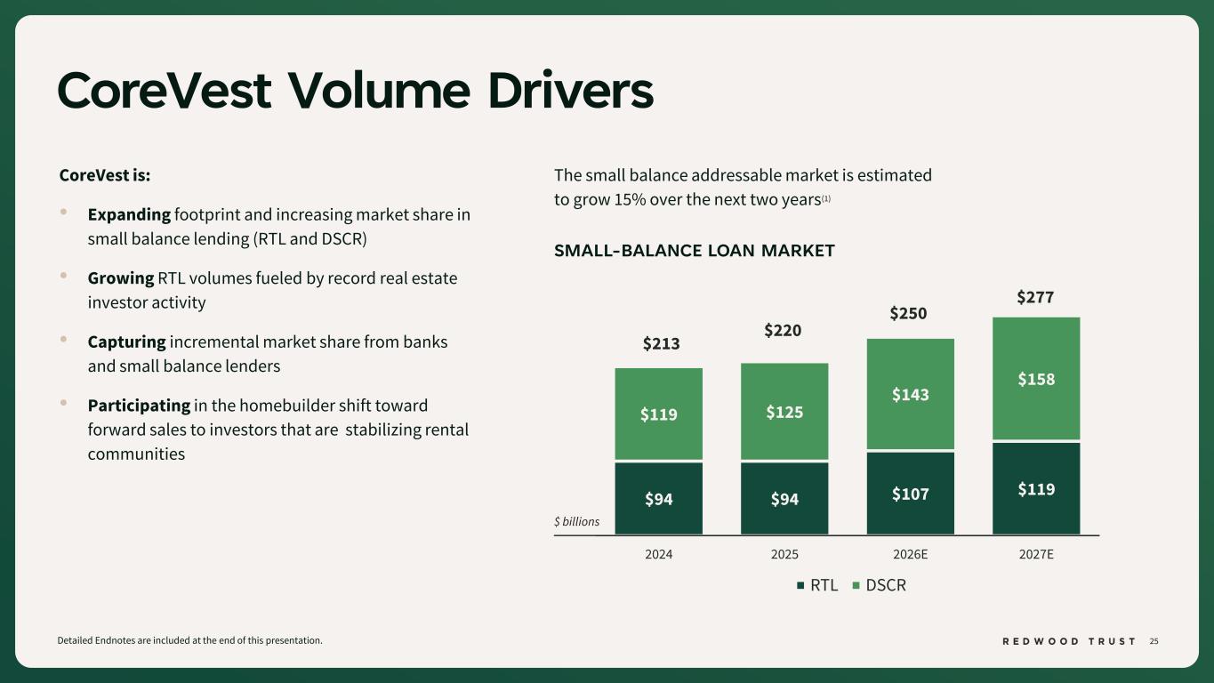 24 $1.7 $2.0 FY'24 FY'25 CoreVest Q4’25 Performance Summary 24 *ROC and Non-GAAP EAD ROC are non-GAAP measures. See “Non-GAAP Disclosures” slides for additional information. Detailed Endnotes are included at the end of this presentation. • ROC of 30% and non-GAAP EAD ROC of 36%* • FY’25 funding volume of $2.0 billion; $460 million in Q4’25 • 50% of FY’25 funded volume was focused on small balance loans (RTL, DSCR) • Net cost to originate improved 22% YoY(1) REDWOOD’S INVESTOR LOAN PLATFORM YEAR OVER YEAR FUNDED VOLUMES 13% YoY Increase NET COST TO ORIGINATE(1) 1.18% 0.92% FY'24 FY'25 22% YoY Improvement $ billions