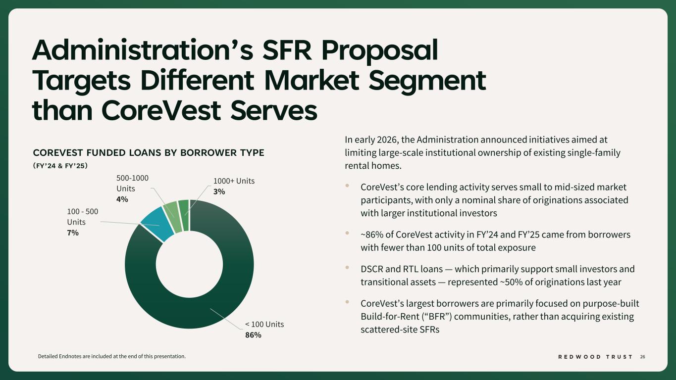 25 CoreVest Volume Drivers Detailed Endnotes are included at the end of this presentation. $94 $94 $107 $119 $119 $125 $143 $158 2024 2025 2026E 2027E RTL DSCR $220 CoreVest is: • Expanding footprint and increasing market share in small balance lending (RTL and DSCR) • Growing RTL volumes fueled by record real estate investor activity • Capturing incremental market share from banks and small balance lenders • Participating in the homebuilder shift toward forward sales to investors that are stabilizing rental communities The small balance addressable market is estimated to grow 15% over the next two years(1) SMALL-BALANCE LOAN MARKET $250 $277 $213 $ billions