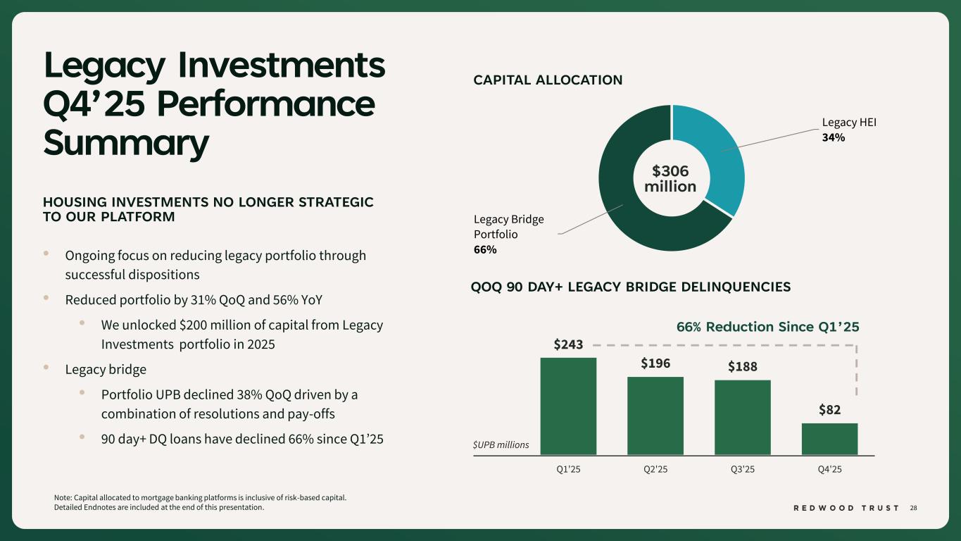 27 Redwood Investments Q4’25 Performance Summary HOUSING INVESTMENTS SOURCED FROM OUR OPERATING PLATFORMS • Generated 17% ROC* • Cost of funds continues to improve, enhancing portfolio economic contribution CAPITAL ALLOCATION *ROC is a non-GAAP measure. See “Non-GAAP Disclosures” slides for additional information. Detailed Endnotes are included at the end of this presentation. Bridge Securities Retained 15% Servicing Investments 27% Term Securities Retained 13% Sequoia Securities Retained 45% $504 million PORTFOLIO DEBT BY MATURITY TYPE(2) 6.96% 7.11% 7.14% 6.90% 6.68% Q4'24 Q1'25 Q2'25 Q3'25 Q4'25 Callable < 1 Year 47% Callable > 1 Yr 53% $2.0 billion Lower Rates Could Unlock Efficient Refinancing on 47% of Debt in the Next 12 Months PORTFOLIO COST OF FUNDS(1)