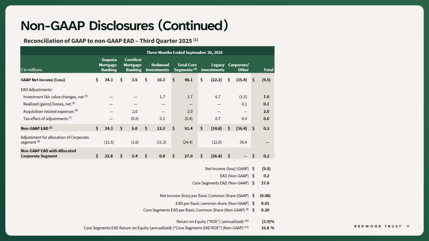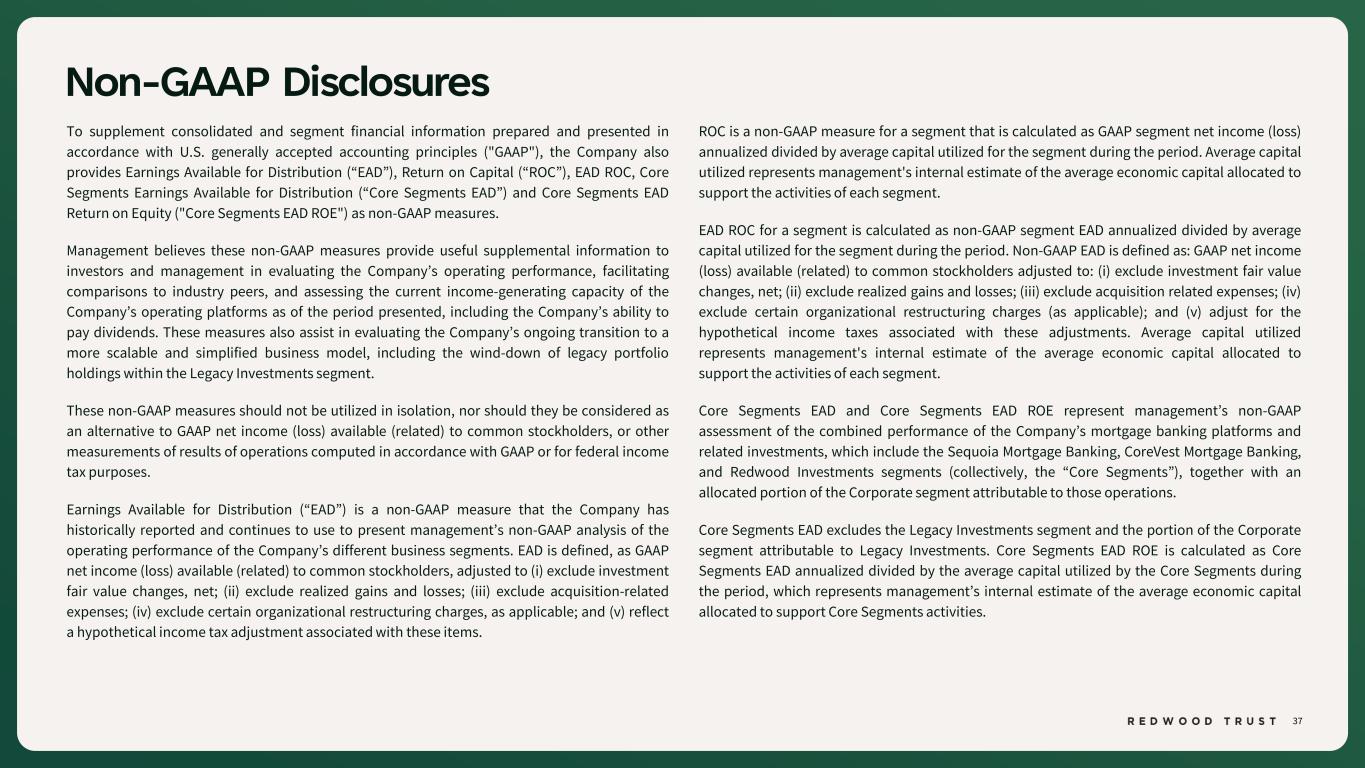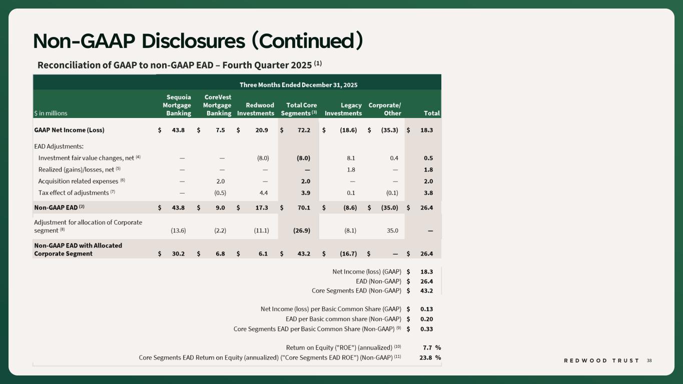 37 Non-GAAP Disclosures To supplement consolidated and segment financial information prepared and presented in accordance with U.S. generally accepted accounting principles ("GAAP"), the Company also provides Earnings Available for Distribution (“EAD”), Return on Capital (“ROC”), EAD ROC, Core Segments Earnings Available for Distribution (“Core Segments EAD”) and Core Segments EAD Return on Equity ("Core Segments EAD ROE") as non-GAAP measures. Management believes these non-GAAP measures provide useful supplemental information to investors and management in evaluating the Company’s operating performance, facilitating comparisons to industry peers, and assessing the current income-generating capacity of the Company’s operating platforms as of the period presented, including the Company’s ability to pay dividends. These measures also assist in evaluating the Company’s ongoing transition to a more scalable and simplified business model, including the wind-down of legacy portfolio holdings within the Legacy Investments segment. These non-GAAP measures should not be utilized in isolation, nor should they be considered as an alternative to GAAP net income (loss) available (related) to common stockholders, or other measurements of results of operations computed in accordance with GAAP or for federal income tax purposes. Earnings Available for Distribution (“EAD”) is a non-GAAP measure that the Company has historically reported and continues to use to present management’s non-GAAP analysis of the operating performance of the Company’s different business segments. EAD is defined, as GAAP net income (loss) available (related) to common stockholders, adjusted to (i) exclude investment fair value changes, net; (ii) exclude realized gains and losses; (iii) exclude acquisition-related expenses; (iv) exclude certain organizational restructuring charges, as applicable; and (v) reflect a hypothetical income tax adjustment associated with these items. ROC is a non-GAAP measure for a segment that is calculated as GAAP segment net income (loss) annualized divided by average capital utilized for the segment during the period. Average capital utilized represents management's internal estimate of the average economic capital allocated to support the activities of each segment. EAD ROC for a segment is calculated as non-GAAP segment EAD annualized divided by average capital utilized for the segment during the period. Non-GAAP EAD is defined as: GAAP net income (loss) available (related) to common stockholders adjusted to: (i) exclude investment fair value changes, net; (ii) exclude realized gains and losses; (iii) exclude acquisition related expenses; (iv) exclude certain organizational restructuring charges (as applicable); and (v) adjust for the hypothetical income taxes associated with these adjustments. Average capital utilized represents management's internal estimate of the average economic capital allocated to support the activities of each segment. Core Segments EAD and Core Segments EAD ROE represent management’s non-GAAP assessment of the combined performance of the Company’s mortgage banking platforms and related investments, which include the Sequoia Mortgage Banking, CoreVest Mortgage Banking, and Redwood Investments segments (collectively, the “Core Segments”), together with an allocated portion of the Corporate segment attributable to those operations. Core Segments EAD excludes the Legacy Investments segment and the portion of the Corporate segment attributable to Legacy Investments. Core Segments EAD ROE is calculated as Core Segments EAD annualized divided by the average capital utilized by the Core Segments during the period, which represents management’s internal estimate of the average economic capital allocated to support Core Segments activities.