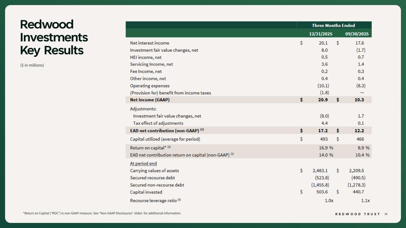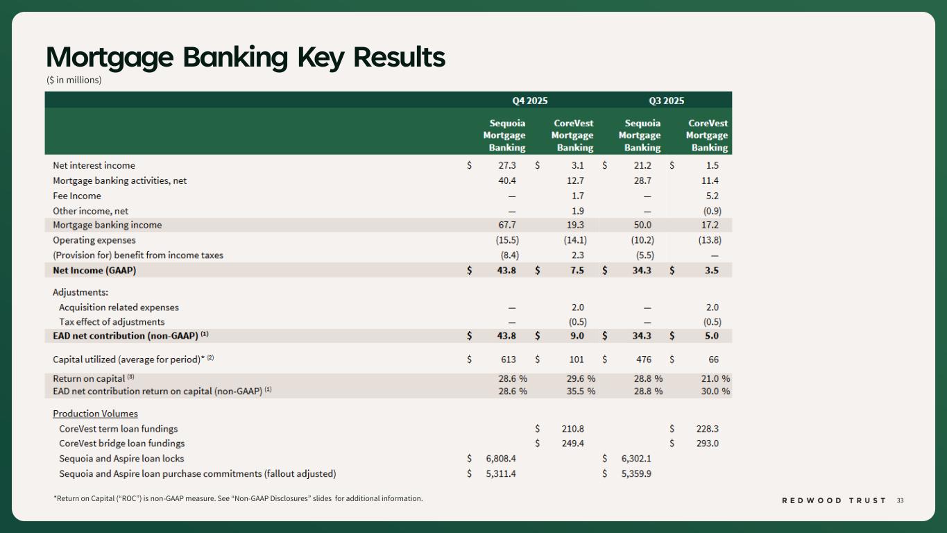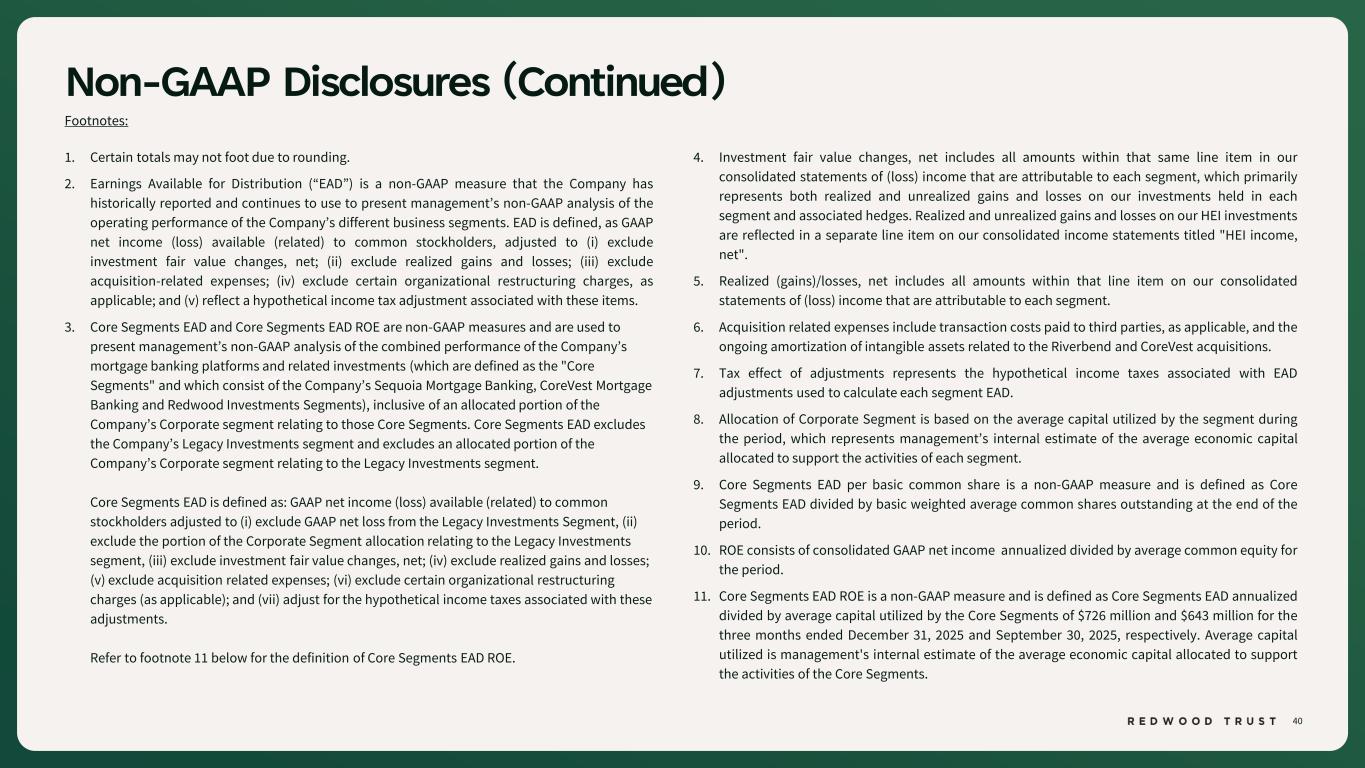 37 Non-GAAP Disclosures To supplement consolidated and segment financial information prepared and presented in accordance with U.S. generally accepted accounting principles ("GAAP"), the Company also provides Earnings Available for Distribution (“EAD”), Return on Capital (“ROC”), EAD ROC, Core Segments Earnings Available for Distribution (“Core Segments EAD”) and Core Segments EAD Return on Equity ("Core Segments EAD ROE") as non-GAAP measures. Management believes these non-GAAP measures provide useful supplemental information to investors and management in evaluating the Company’s operating performance, facilitating comparisons to industry peers, and assessing the current income-generating capacity of the Company’s operating platforms as of the period presented, including the Company’s ability to pay dividends. These measures also assist in evaluating the Company’s ongoing transition to a more scalable and simplified business model, including the wind-down of legacy portfolio holdings within the Legacy Investments segment. These non-GAAP measures should not be utilized in isolation, nor should they be considered as an alternative to GAAP net income (loss) available (related) to common stockholders, or other measurements of results of operations computed in accordance with GAAP or for federal income tax purposes. Earnings Available for Distribution (“EAD”) is a non-GAAP measure that the Company has historically reported and continues to use to present management’s non-GAAP analysis of the operating performance of the Company’s different business segments. EAD is defined, as GAAP net income (loss) available (related) to common stockholders, adjusted to (i) exclude investment fair value changes, net; (ii) exclude realized gains and losses; (iii) exclude acquisition-related expenses; (iv) exclude certain organizational restructuring charges, as applicable; and (v) reflect a hypothetical income tax adjustment associated with these items. ROC is a non-GAAP measure for a segment that is calculated as GAAP segment net income (loss) annualized divided by average capital utilized for the segment during the period. Average capital utilized represents management's internal estimate of the average economic capital allocated to support the activities of each segment. EAD ROC for a segment is calculated as non-GAAP segment EAD annualized divided by average capital utilized for the segment during the period. Non-GAAP EAD is defined as: GAAP net income (loss) available (related) to common stockholders adjusted to: (i) exclude investment fair value changes, net; (ii) exclude realized gains and losses; (iii) exclude acquisition related expenses; (iv) exclude certain organizational restructuring charges (as applicable); and (v) adjust for the hypothetical income taxes associated with these adjustments. Average capital utilized represents management's internal estimate of the average economic capital allocated to support the activities of each segment. Core Segments EAD and Core Segments EAD ROE represent management’s non-GAAP assessment of the combined performance of the Company’s mortgage banking platforms and related investments, which include the Sequoia Mortgage Banking, CoreVest Mortgage Banking, and Redwood Investments segments (collectively, the “Core Segments”), together with an allocated portion of the Corporate segment attributable to those operations. Core Segments EAD excludes the Legacy Investments segment and the portion of the Corporate segment attributable to Legacy Investments. Core Segments EAD ROE is calculated as Core Segments EAD annualized divided by the average capital utilized by the Core Segments during the period, which represents management’s internal estimate of the average economic capital allocated to support Core Segments activities.