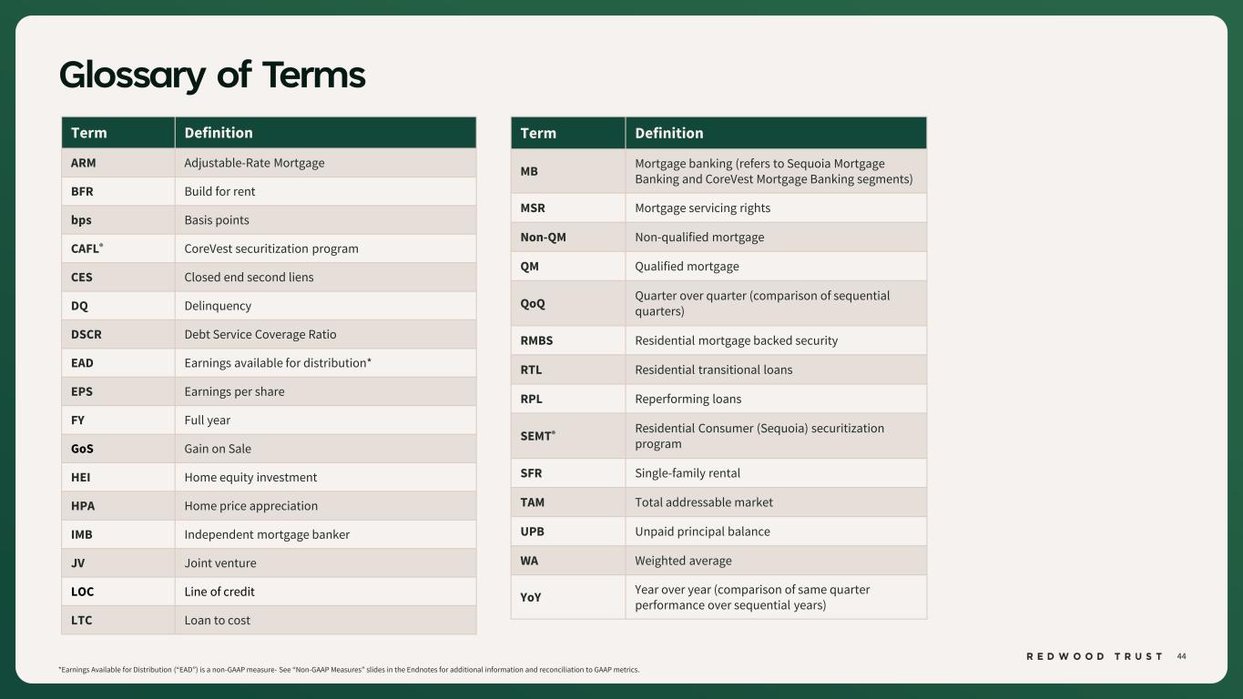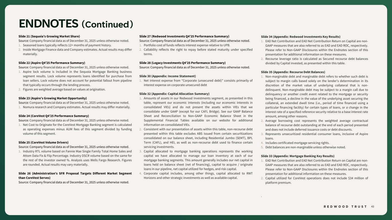 43 ENDNOTES (Continued) Slide 21 (Sequoia’s Growing Market Share) Source: Company financial data as of December 31, 2025 unless otherwise noted. 1. Seasoned loans typically reflects 12+ months of payment history. 2. Inside Mortgage Finance data and Company estimates. Actual results may differ materially. Slide 22 (Aspire Q4’25 Performance Summary) Source: Company financial data as of December 31, 2025 unless otherwise noted. 1. Aspire lock volume is included in the Sequoia Mortgage Banking business segment results. Lock volume represents loans identified for purchase from loan sellers. Lock volume does not account for potential fallout from pipeline that typically occurs through the lending process. 2. Figures are weighted average based on values at origination. Slide 23 (Aspire’s Growing Market Opportunity) Source: Company financial data as of December 31, 2025 unless otherwise noted. 1. Nomura research and Company estimates. Actual results may differ materially. Slide 24 (CoreVest Q4’25 Performance Summary) Source: Company financial data as of December 31, 2025 unless otherwise noted. 1. Net Cost to Originate for the CoreVest Mortgage Banking segment is calculated as operating expenses minus AUM fees of this segment divided by funding volume of this segment. Slide 25 (CoreVest Volume Drivers) Source: Company financial data as of December 31, 2025 unless otherwise noted. 1. Industry RTL volume based on Fannie Mae Single Family Total Home Sales and Attom Data Fix & Flip Percentage. Industry DSCR volume based on the same for the rest of the investor owned %. Analysis uses Wells Fargo Research. Figures are rounded. Actual results may vary materially. Slide 26 (Administration’s SFR Proposal Targets Different Market Segment than CoreVest Serves) Source: Company financial data as of December 31, 2025 unless otherwise noted. Slide 34 (Appendix: Redwood Investments Key Results) 1. EAD Net Contribution and EAD Net Contribution Return on Capital are non- GAAP measures that are also referred to as EAD and EAD ROC, respectively. Please refer to Non-GAAP Disclosures within the Endnotes section of this presentation for additional information on these measures. 2. Recourse leverage ratio is calculated as Secured recourse debt balances divided by Capital invested, as presented within this table. Slide 35 (Appendix: Recourse Debt Balances) 1. Non-marginable debt and marginable debt refers to whether such debt is subject to margin calls based solely on the lender’s determination in its discretion of the market value of underlying collateral that is non- delinquent. Non-marginable debt may be subject to a margin call due to delinquency or another credit event related to the mortgage or security being financed, a decline in the value of the underlying asset securing the collateral, an extended dwell time (i.e., period of time financed using a particular financing facility) for certain types of loans, or a change in the interest rate of a specified reference security relative to a base interest rate amount, among other reasons. 2. Average borrowing cost represents the weighted average contractual balance of recourse debt outstanding at the end of each period presented and does not include deferred issuance costs or debt discounts. 3. Represents unsecuritized residential consumer loans, inclusive of Aspire loans. 4. Includes certificated mortgage servicing rights. 5. Debt balances are non-marginable unless otherwise noted. Slide 33 (Appendix: Mortgage Banking Key Results) 1. EAD Net Contribution and EAD Net Contribution Return on Capital are non- GAAP measures that are also referred to as EAD and EAD ROC, respectively. Please refer to Non-GAAP Disclosures within the Endnotes section of this presentation for additional information on these measures. 2. Capital utilized for CoreVest operations does not include $34 million of platform premium. . Slide 27 (Redwood Investments Q4’25 Performance Summary) Source: Company financial data as of December 31, 2025 unless otherwise noted. 1. Portfolio cost of funds reflects interest expense relative to UPB. 2. Callability reflects the right to repay before stated maturity under specified terms. Slide 28 (Legacy Investments Q4’25 Performance Summary) Source: Company financial data as of December 31, 2025 unless otherwise noted. Slide 30 (Appendix: Income Statement) 1. Net interest expense from “Corporate (unsecured debt)” consists primarily of interest expense on corporate unsecured debt Slide 32 (Appendix: Capital Allocation Summary) 1. Amounts of assets in our Redwood Investments segment, as presented in this table, represent our economic interests (including our economic interests in consolidated VIEs) and do not present the assets within VIEs that we consolidate under GAAP (except for our CAFL Bridge). See our GAAP Balance Sheet and Reconciliation to Non-GAAP Economic Balance Sheet in the Supplemental Financial Tables available on our website for additional information on consolidated VIEs. 2. Consistent with our presentation of assets within this table, non-recourse debt presented within this table excludes ABS issued from certain securitizations consolidated on our balance sheet, including Residential Jumbo (SEMT), BPL Term (CAFL), and HEI, as well as non-recourse debt used to finance certain servicing investments. 3. Capital allocated to mortgage banking operations represents the working capital we have allocated to manage our loan inventory at each of our mortgage banking segments. This amount generally includes our net capital in loans held on balance sheet (net of financing), capital to acquire / originate loans in our pipeline, net capital utilized for hedges, and risk capital. 4. Corporate capital includes, among other things, capital allocated to RWT Horizons and other strategic investments as well as available capital.