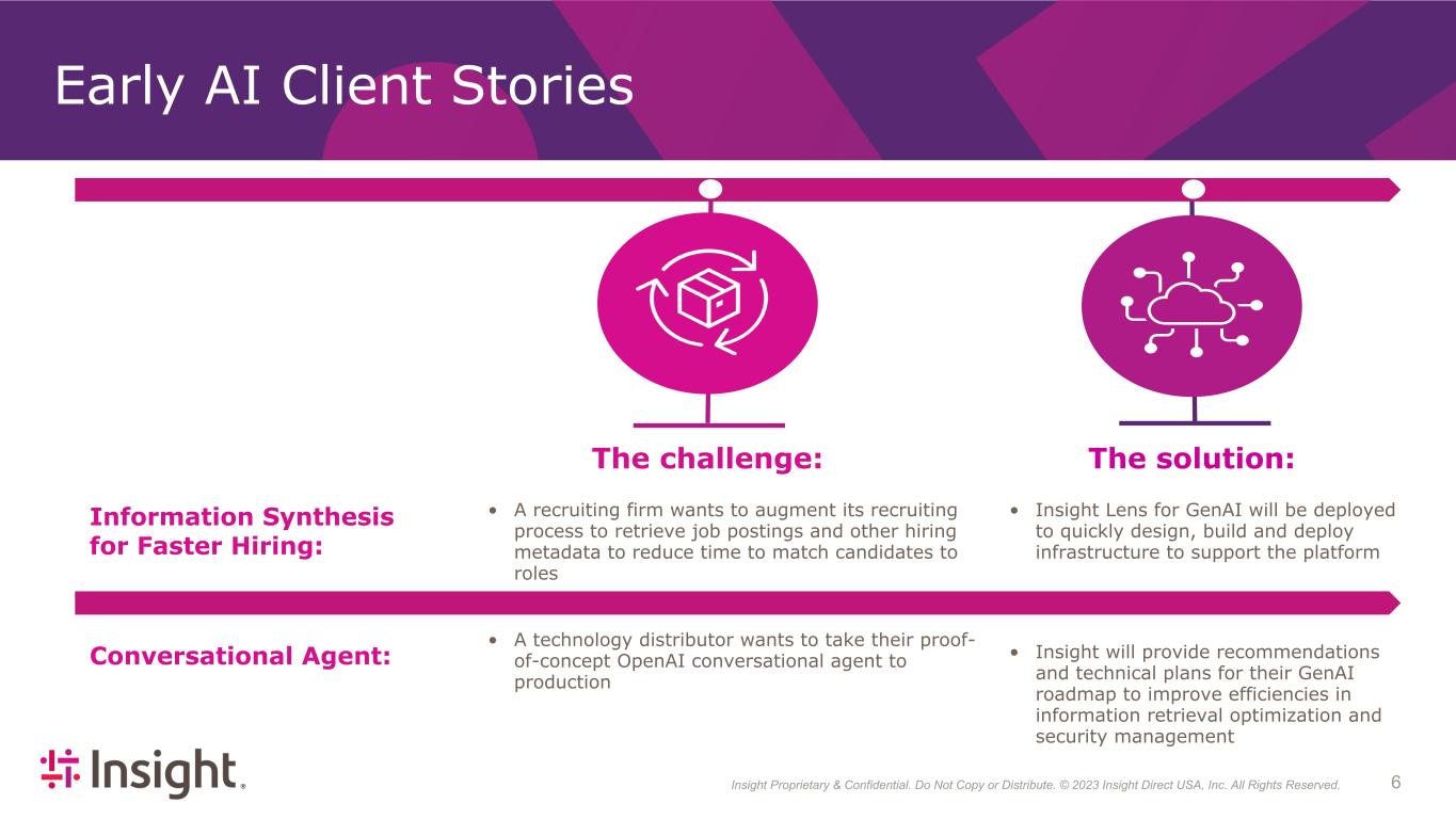 5Insight Proprietary & Confidential. Do Not Copy or Distribute. © 2023 Insight Direct USA, Inc. All Rights Reserved. Our services Managed Services Eliminate business disruption and strategically align resources Consulting Services Create competitive advantages and improve operations by aligning business goals to IT and product strategies Hardware, Software and Lifecycle Services Simplify supply chain and streamline costs across the global hardware and software lifecycle Intelligent Edge Gather and utilize data in the most efficient way possible to enable real-time decision- making and affect pivotal outcomes Data and Al Leverage analytics and Al to transform business operations and user experiences Modern Infrastructure Architect and modernize multicloud and networking solutions to drive business transformation Modern Apps Create new product experiences and transform legacy applications to drive increased business value Modern Workplace Create a productive, flexible and secure workplace Cybersecurity Mitigate risks and secure business assets Well Positioned to Help Organizations Our expertise