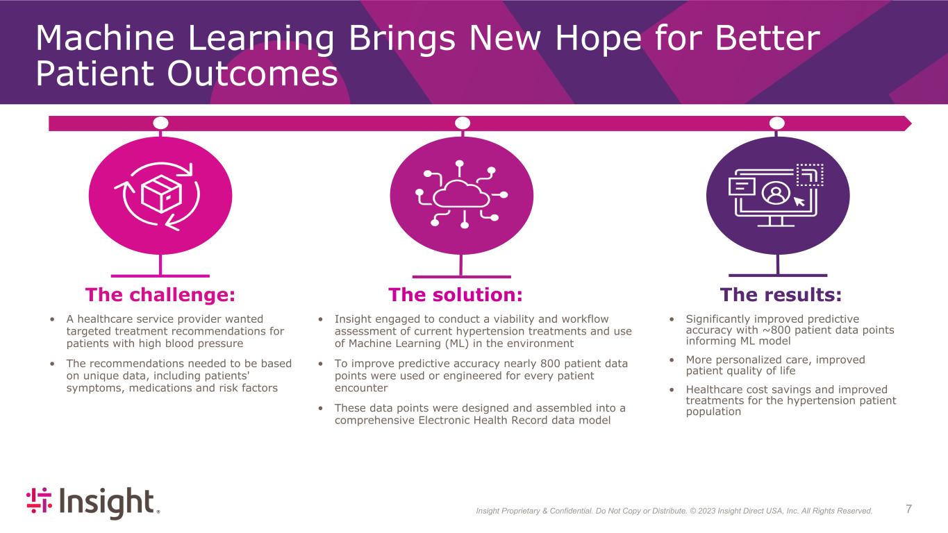 Insight Proprietary & Confidential. Do Not Copy or Distribute. © 2022 Insight Direct USA, Inc. All Rights Reserved. 73 Machine Learning Brings New Hope for Better Patient Outcomes The challenge: The results: • A healthcare service provider wanted targeted treatment recommendations for patients with high blood pressure • The recommendations needed to be based on unique data, including patients' symptoms, medications and risk factors • Significantly improved predictive accuracy with ~800 patient data points informing ML model • More personalized care, improved patient quality of life • Healthcare cost savings and improved treatments for the hypertension patient population • Insight engaged to conduct a viability and workflow assessment of current hypertension treatments and use of Machine Learning (ML) in the environment • To improve predictive accuracy nearly 800 patient data points were used or engineered for every patient encounter • These data points were designed and assembled into a comprehensive Electronic Health Record data model The solution: