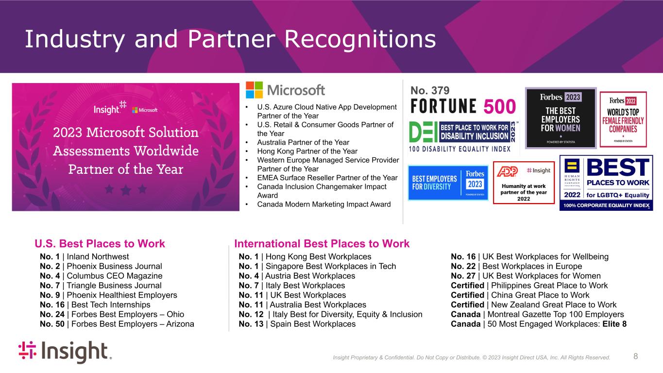 Insight Proprietary & Confidential. Do Not Copy or Distribute. © 2022 Insight Direct USA, Inc. All Rights Reserved. 83 Industry and Partner Recognitions U.S. Best Places to Work International Best Places to Work No. 1 | Inland Northwest No. 2 | Phoenix Business Journal No. 4 | Columbus CEO Magazine No. 7 | Triangle Business Journal No. 9 | Phoenix Healthiest Employers No. 16 | Best Tech Internships No. 24 | Forbes Best Employers – Ohio No. 50 | Forbes Best Employers – Arizona No. 1 | Hong Kong Best Workplaces No. 1 | Singapore Best Workplaces in Tech No. 4 | Austria Best Workplaces No. 7 | Italy Best Workplaces No. 11 | UK Best Workplaces No. 11 | Australia Best Workplaces No. 12 | Italy Best for Diversity, Equity & Inclusion No. 13 | Spain Best Workplaces No. 16 | UK Best Workplaces for Wellbeing No. 22 | Best Workplaces in Europe No. 27 | UK Best Workplaces for Women Certified | Philippines Great Place to Work Certified | China Great Place to Work Certified | New Zealand Great Place to Work Canada | Montreal Gazette Top 100 Employers Canada | 50 Most Engaged Workplaces: Elite 8 • U.S. Azure Cloud Native App Development Partner of the Year • U.S. Retail & Consumer Goods Partner of the Year • Australia Partner of the Year • Hong Kong Partner of the Year • Western Europe Managed Service Provider Partner of the Year • EMEA Surface Reseller Partner of the Year • Canada Inclusion Changemaker Impact Award • Canada Modern Marketing Impact Award No. 379