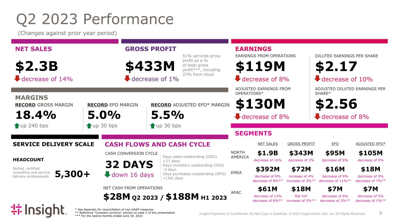 Insight Proprietary & Confidential. Do Not Copy or Distribute. © 2022 Insight Direct USA, Inc. All Rights Reserved. 93 Q2 2023 Performance (Changes against prior year period) NET SALES $2.3B decrease of 14% GROSS PROFIT $433M decrease of 1% 51% services gross profit as a % of total gross profit***, including 23% from cloud EARNINGS EARNINGS FROM OPERATIONS $119M decrease of 8% DILUTED EARNINGS PER SHARE $2.17 decrease of 10% SEGMENTS HEADCOUNT Skilled, certified consulting and service delivery professionals 5,300+ SERVICE DELIVERY SCALE ADJUSTED EARNINGS FROM OPERATIONS* $130M decrease of 8% ADJUSTED DILUTED EARNINGS PER SHARE* $2.56 decrease of 8% MARGINS RECORD GROSS MARGIN 18.4% up 240 bps RECORD EFO MARGIN 5.0% up 30 bps RECORD ADJUSTED EFO* MARGIN 5.5% up 30 bps CASH CONVERSION CYCLE 32 DAYS down 16 days Days sales outstanding (DSO) +21 days Days inventory outstanding (DIO) -3 days Days purchases outstanding (DPO) +(34) days NET CASH FROM OPERATIONS $28M Q2 2023 / $188M H1 2023 NET SALES GROSS PROFIT EFO ADJUSTED EFO* NORTH AMERICA $1.9B $343M $95M $105M decrease of 16% decrease of 2% decrease of 8% decrease of 9% EMEA $392M $72M $16M $18M decrease of 8% increase of 4% decrease of 9% decrease of 5% decrease of 8%** increase of 3%** decrease of 11%** decrease of 7%** APAC $61M $18M $7M $7M decrease of 13% flat YoY decrease of 6% decrease of 5% decrease of 8%** increase of 5%** decrease of 2%** decrease of 1%** CASH FLOWS AND CASH CYCLE * See Appendix for reconciliation of non-GAAP measures ** Reference “Constant currency” section on slide 2 of this presentation *** For the twelve months ended June 30, 2023