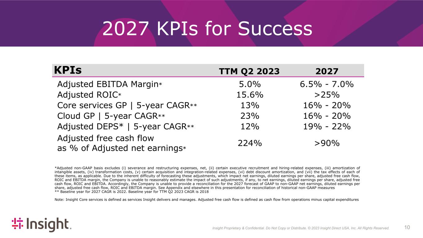 Insight Proprietary & Confidential. Do Not Copy or Distribute. © 2022 Insight Direct USA, Inc. All Rights Reserved. 103 2027 KPIs for Success KPIs TTM Q2 2023 2027 Adjusted EBITDA Margin* 5.0% 6.5% - 7.0% Adjusted ROIC* 15.6% >25% Core services GP | 5-year CAGR** 13% 16% - 20% Cloud GP | 5-year CAGR** 23% 16% - 20% Adjusted DEPS* | 5-year CAGR** 12% 19% - 22% Adjusted free cash flow as % of Adjusted net earnings* 224% >90% *Adjusted non-GAAP basis excludes (i) severance and restructuring expenses, net, (ii) certain executive recruitment and hiring-related expenses, (iii) amortization of intangible assets, (iv) transformation costs, (v) certain acquisition and integration-related expenses, (vi) debt discount amortization, and (vii) the tax effects of each of these items, as applicable. Due to the inherent difficulty of forecasting these adjustments, which impact net earnings, diluted earnings per share, adjusted free cash flow, ROIC and EBITDA margin, the Company is unable to reasonably estimate the impact of such adjustments, if any, to net earnings, diluted earnings per share, adjusted free cash flow, ROIC and EBITDA. Accordingly, the Company is unable to provide a reconciliation for the 2027 forecast of GAAP to non-GAAP net earnings, diluted earnings per share, adjusted free cash flow, ROIC and EBITDA margin. See Appendix and elsewhere in this presentation for reconciliation of historical non-GAAP measures ** Baseline year for 2027 CAGR is 2022. Baseline year for TTM Q2 2023 CAGR is 2018 Note: Insight Core services is defined as services Insight delivers and manages. Adjusted free cash flow is defined as cash flow from operations minus capital expenditures
