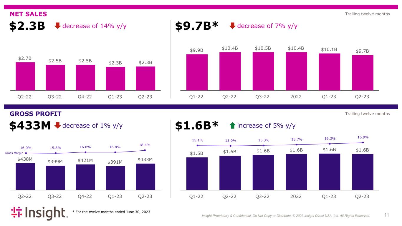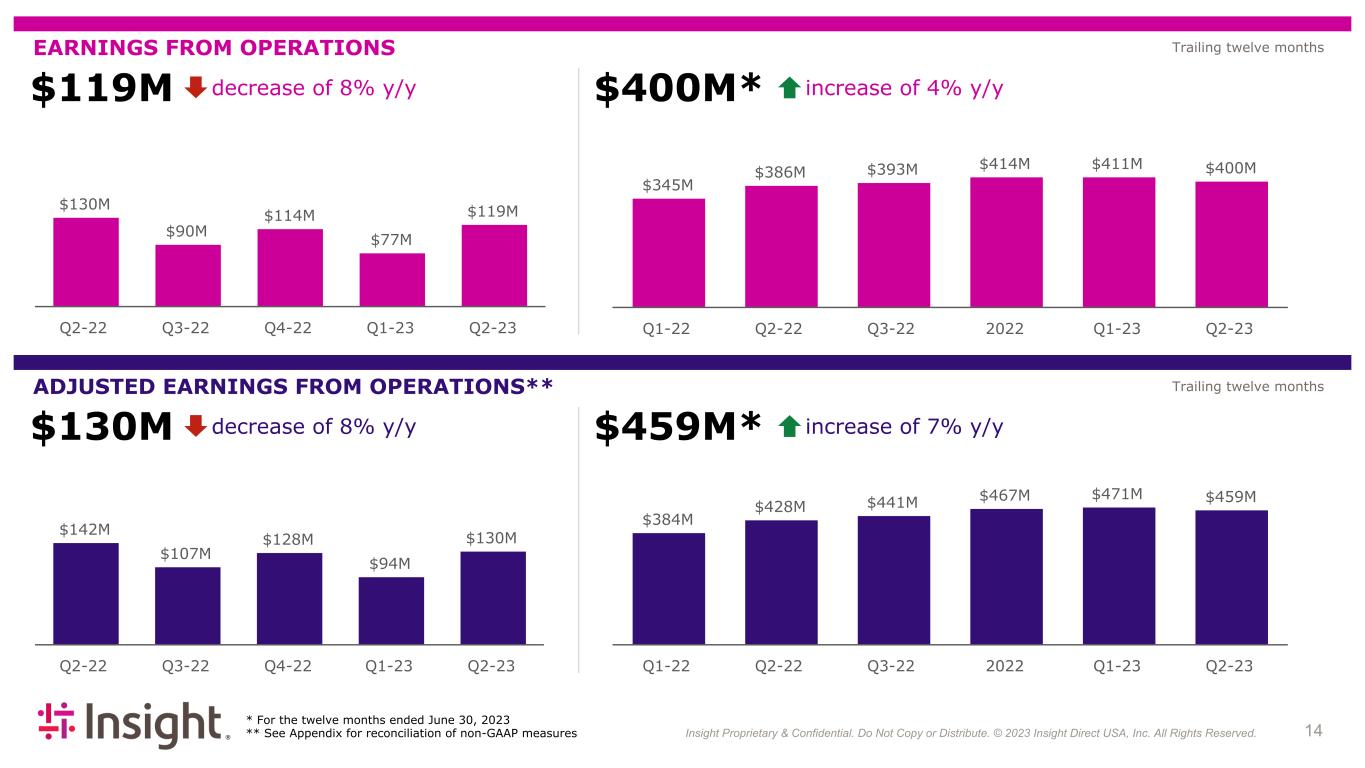 Insight Proprietary & Confidential. Do Not Copy or Distribute. © 2022 Insight Direct USA, Inc. All Rights Reserved. 113 $2.3B NET SALES decrease of 14% y/y $433M GROSS PROFIT decrease of 1% y/y $9.7B* decrease of 7% y/y * For the twelve months ended June 30, 2023 $1.6B* increase of 5% y/y $2.7B $2.5B $2.5B $2.3B $2.3B Q2-22 Q3-22 Q4-22 Q1-23 Q2-23 $9.9B $10.4B $10.5B $10.4B $10.1B $9.7B Q1-22 Q2-22 Q3-22 2022 Q1-23 Q2-23 $438M $399M $421M $391M $433M Q2-22 Q3-22 Q4-22 Q1-23 Q2-23 $1.5B $1.6B $1.6B $1.6B $1.6B $1.6B Q1-22 Q2-22 Q3-22 2022 Q1-23 Q2-23 16.0% 15.8% 16.8% 16.8% 18.4% 15.1% 15.0% 15.3% 15.7% 16.3% 16.9% Gross Margin Trailing twelve months Trailing twelve months