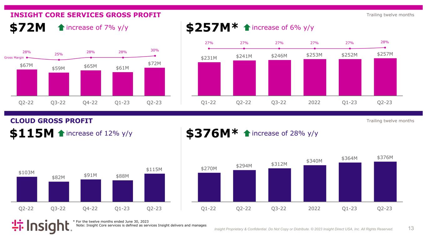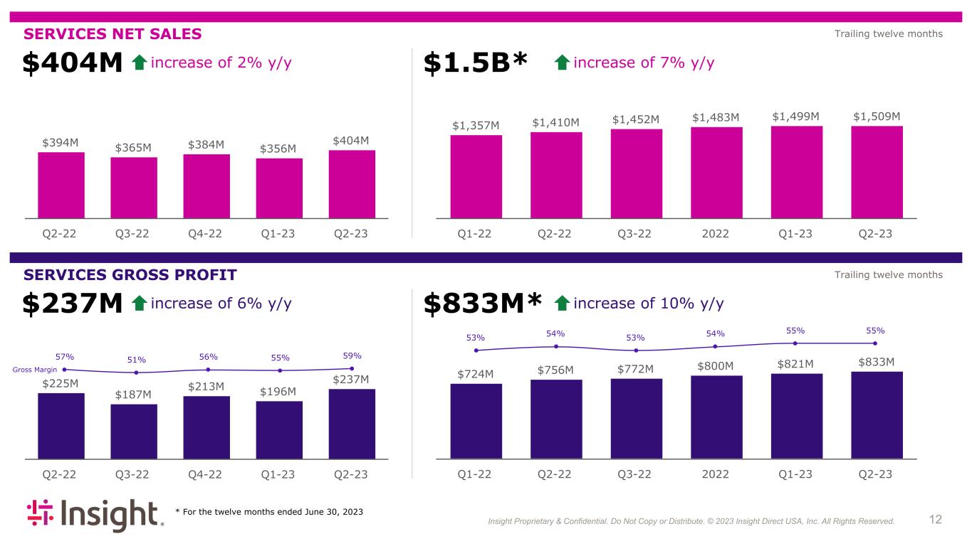 Insight Proprietary & Confidential. Do Not Copy or Distribute. © 2022 Insight Direct USA, Inc. All Rights Reserved. 123 $833M* $404M SERVICES NET SALES increase of 2% y/y $237M SERVICES GROSS PROFIT increase of 6% y/y $1.5B* increase of 7% y/y * For the twelve months ended June 30, 2023 increase of 10% y/y $394M $365M $384M $356M $404M Q2-22 Q3-22 Q4-22 Q1-23 Q2-23 $225M $187M $213M $196M $237M Q2-22 Q3-22 Q4-22 Q1-23 Q2-23 $724M $756M $772M $800M $821M $833M Q1-22 Q2-22 Q3-22 2022 Q1-23 Q2-23 $1,357M $1,410M $1,452M $1,483M $1,499M $1,509M Q1-22 Q2-22 Q3-22 2022 Q1-23 Q2-23 57% 51% 56% 55% 59% Gross Margin 53% 54% 53% 54% 55% 55% Trailing twelve months Trailing twelve months