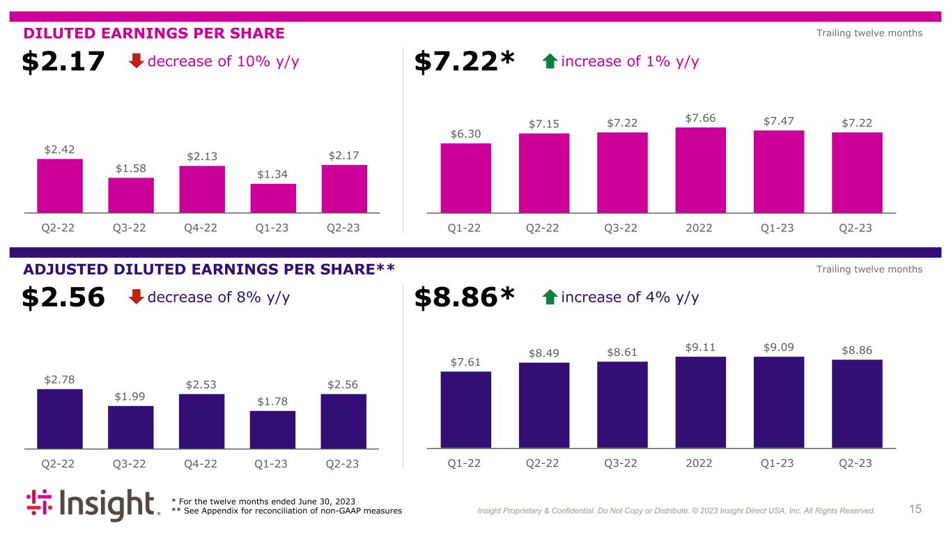Insight Proprietary & Confidential. Do Not Copy or Distribute. © 2022 Insight Direct USA, Inc. All Rights Reserved. 153 DILUTED EARNINGS PER SHARE decrease of 10% y/y ADJUSTED DILUTED EARNINGS PER SHARE** $7.22* $2.78 $1.99 $2.53 $1.78 $2.56 Q2-22 Q3-22 Q4-22 Q1-23 Q2-23 $7.61 $8.49 $8.61 $9.11 $9.09 $8.86 Q1-22 Q2-22 Q3-22 2022 Q1-23 Q2-23 * For the twelve months ended June 30, 2023 ** See Appendix for reconciliation of non-GAAP measures $2.56 decrease of 8% y/y $8.86* increase of 4% y/y $2.17 $2.42 $1.58 $2.13 $1.34 $2.17 Q2-22 Q3-22 Q4-22 Q1-23 Q2-23 increase of 1% y/y $6.30 $7.15 $7.22 $7.66 $7.47 $7.22 Q1-22 Q2-22 Q3-22 2022 Q1-23 Q2-23 Trailing twelve months Trailing twelve months