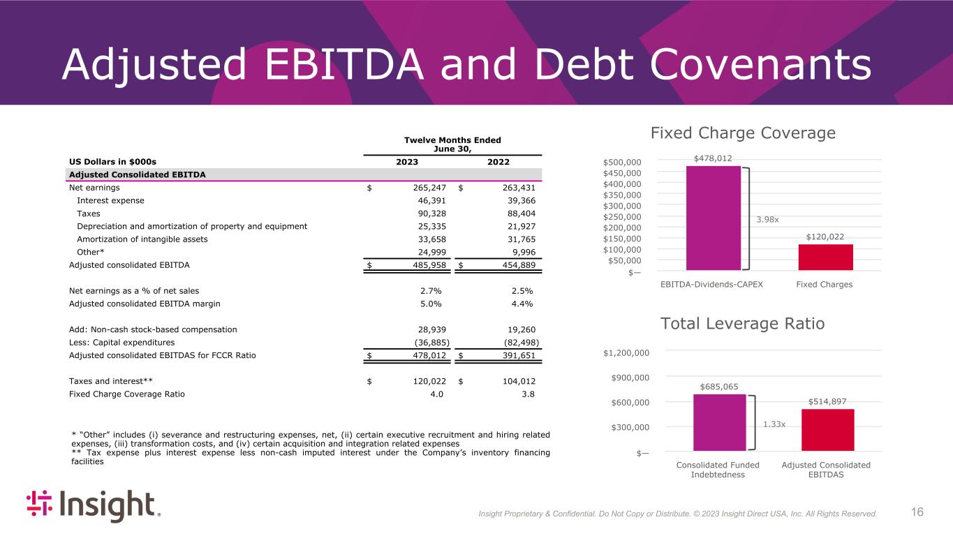 Insight Proprietary & Confidential. Do Not Copy or Distribute. © 2022 Insight Direct USA, Inc. All Rights Reserved. 163 Adjusted EBITDA and Debt Covenants Twelve Months Ended June 30, US Dollars in $000s 2023 2022 Adjusted Consolidated EBITDA Net earnings $ 265,247 $ 263,431 Interest expense 46,391 39,366 Taxes 90,328 88,404 Depreciation and amortization of property and equipment 25,335 21,927 Amortization of intangible assets 33,658 31,765 Other* 24,999 9,996 Adjusted consolidated EBITDA $ 485,958 $ 454,889 Net earnings as a % of net sales 2.7 % 2.5 % Adjusted consolidated EBITDA margin 5.0 % 4.4 % Add: Non-cash stock-based compensation 28,939 19,260 Less: Capital expenditures (36,885) (82,498) Adjusted consolidated EBITDAS for FCCR Ratio $ 478,012 $ 391,651 Taxes and interest** $ 120,022 $ 104,012 Fixed Charge Coverage Ratio 4.0 3.8 Fixed Charge Coverage $478,012 $120,022 EBITDA-Dividends-CAPEX Fixed Charges $— $50,000 $100,000 $150,000 $200,000 $250,000 $300,000 $350,000 $400,000 $450,000 $500,000 Total Leverage Ratio $685,065 $514,897 Consolidated Funded Indebtedness Adjusted Consolidated EBITDAS $— $300,000 $600,000 $900,000 $1,200,000 * “Other” includes (i) severance and restructuring expenses, net, (ii) certain executive recruitment and hiring related expenses, (iii) transformation costs, and (iv) certain acquisition and integration related expenses ** Tax expense plus interest expense less non-cash imputed interest under the Company’s inventory financing facilities 3.98x 1.33x