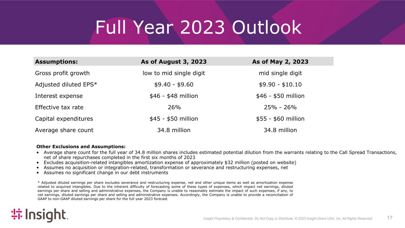Insight Proprietary & Confidential. Do Not Copy or Distribute. © 2022 Insight Direct USA, Inc. All Rights Reserved. 173 Full Year 2023 Outlook Assumptions: As of August 3, 2023 As of May 2, 2023 Gross profit growth low to mid single digit mid single digit Adjusted diluted EPS* $9.40 - $9.60 $9.90 - $10.10 Interest expense $46 - $48 million $46 - $50 million Effective tax rate 26% 25% - 26% Capital expenditures $45 - $50 million $55 - $60 million Average share count 34.8 million 34.8 million Other Exclusions and Assumptions: • Average share count for the full year of 34.8 million shares includes estimated potential dilution from the warrants relating to the Call Spread Transactions, net of share repurchases completed in the first six months of 2023 • Excludes acquisition-related intangibles amortization expense of approximately $32 million (posted on website) • Assumes no acquisition or integration-related, transformation or severance and restructuring expenses, net • Assumes no significant change in our debt instruments * Adjusted diluted earnings per share excludes severance and restructuring expense, net and other unique items as well as amortization expense related to acquired intangibles. Due to the inherent difficulty of forecasting some of these types of expenses, which impact net earnings, diluted earnings per share and selling and administrative expenses, the Company is unable to reasonably estimate the impact of such expenses, if any, to net earnings, diluted earnings per share and selling and administrative expenses. Accordingly, the Company is unable to provide a reconciliation of GAAP to non-GAAP diluted earnings per share for the full year 2023 forecast