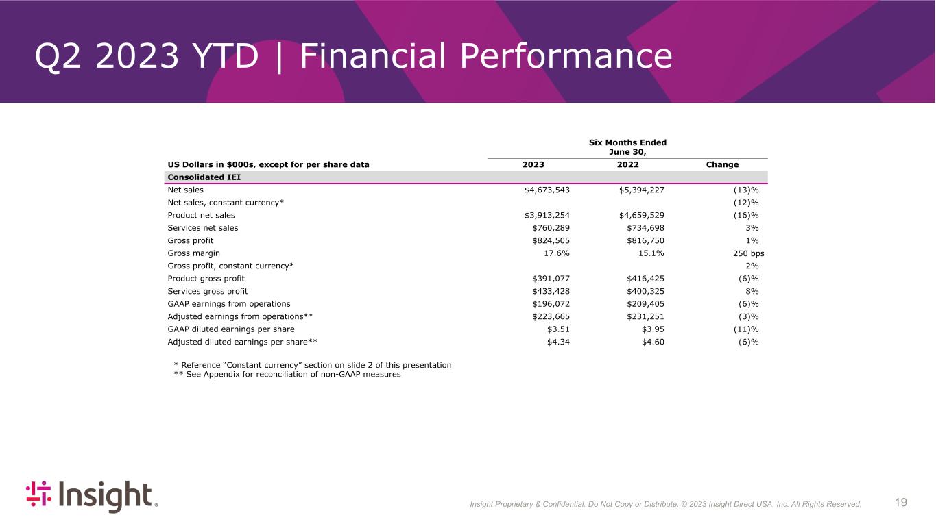 Insight Proprietary & Confidential. Do Not Copy or Distribute. © 2022 Insight Direct USA, Inc. All Rights Reserved. 193 Q2 2023 YTD | Financial Performance Six Months Ended June 30, US Dollars in $000s, except for per share data 2023 2022 Change Consolidated IEI Net sales $4,673,543 $5,394,227 (13) % Net sales, constant currency* (12) % Product net sales $3,913,254 $4,659,529 (16) % Services net sales $760,289 $734,698 3 % Gross profit $824,505 $816,750 1 % Gross margin 17.6 % 15.1 % 250 bps Gross profit, constant currency* 2 % Product gross profit $391,077 $416,425 (6) % Services gross profit $433,428 $400,325 8 % GAAP earnings from operations $196,072 $209,405 (6) % Adjusted earnings from operations** $223,665 $231,251 (3) % GAAP diluted earnings per share $3.51 $3.95 (11) % Adjusted diluted earnings per share** $4.34 $4.60 (6) % * Reference “Constant currency” section on slide 2 of this presentation ** See Appendix for reconciliation of non-GAAP measures