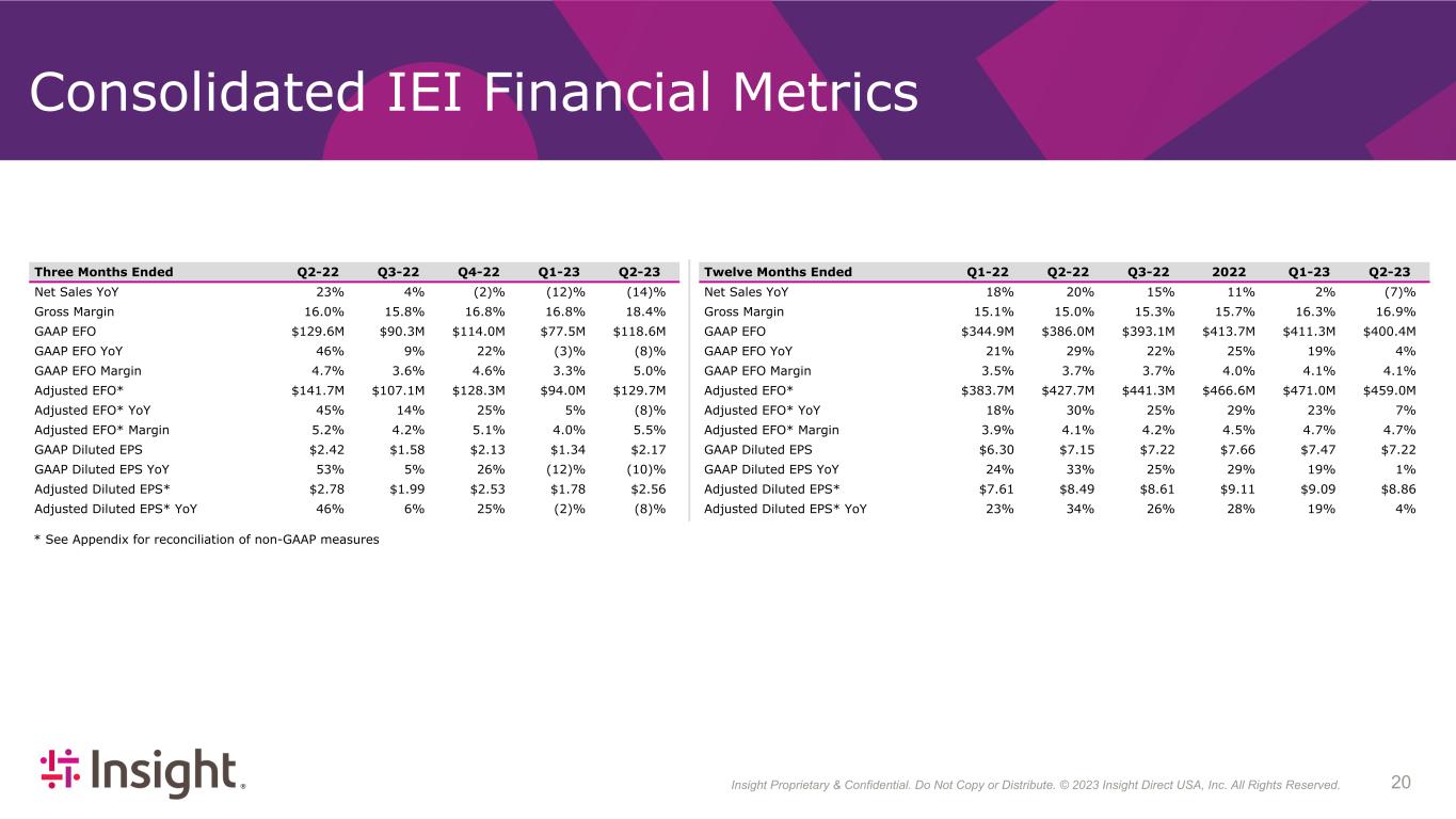 Insight Proprietary & Confidential. Do Not Copy or Distribute. © 2022 Insight Direct USA, Inc. All Rights Reserved. 203 * See Appendix for reconciliation of non-GAAP measures Consolidated IEI Financial Metrics Three Months Ended Q2-22 Q3-22 Q4-22 Q1-23 Q2-23 Net Sales YoY 23 % 4 % (2) % (12) % (14) % Gross Margin 16.0 % 15.8 % 16.8 % 16.8 % 18.4 % GAAP EFO $129.6M $90.3M $114.0M $77.5M $118.6M GAAP EFO YoY 46 % 9 % 22 % (3) % (8) % GAAP EFO Margin 4.7 % 3.6 % 4.6 % 3.3 % 5.0 % Adjusted EFO* $141.7M $107.1M $128.3M $94.0M $129.7M Adjusted EFO* YoY 45 % 14 % 25 % 5 % (8) % Adjusted EFO* Margin 5.2 % 4.2 % 5.1 % 4.0 % 5.5 % GAAP Diluted EPS $2.42 $1.58 $2.13 $1.34 $2.17 GAAP Diluted EPS YoY 53 % 5 % 26 % (12) % (10) % Adjusted Diluted EPS* $2.78 $1.99 $2.53 $1.78 $2.56 Adjusted Diluted EPS* YoY 46 % 6 % 25 % (2) % (8) % Twelve Months Ended Q1-22 Q2-22 Q3-22 2022 Q1-23 Q2-23 Net Sales YoY 18 % 20 % 15 % 11 % 2 % (7) % Gross Margin 15.1 % 15.0 % 15.3 % 15.7 % 16.3 % 16.9 % GAAP EFO $344.9M $386.0M $393.1M $413.7M $411.3M $400.4M GAAP EFO YoY 21 % 29 % 22 % 25 % 19 % 4 % GAAP EFO Margin 3.5 % 3.7 % 3.7 % 4.0 % 4.1 % 4.1 % Adjusted EFO* $383.7M $427.7M $441.3M $466.6M $471.0M $459.0M Adjusted EFO* YoY 18 % 30 % 25 % 29 % 23 % 7 % Adjusted EFO* Margin 3.9 % 4.1 % 4.2 % 4.5 % 4.7 % 4.7 % GAAP Diluted EPS $6.30 $7.15 $7.22 $7.66 $7.47 $7.22 GAAP Diluted EPS YoY 24 % 33 % 25 % 29 % 19 % 1 % Adjusted Diluted EPS* $7.61 $8.49 $8.61 $9.11 $9.09 $8.86 Adjusted Diluted EPS* YoY 23 % 34 % 26 % 28 % 19 % 4 %