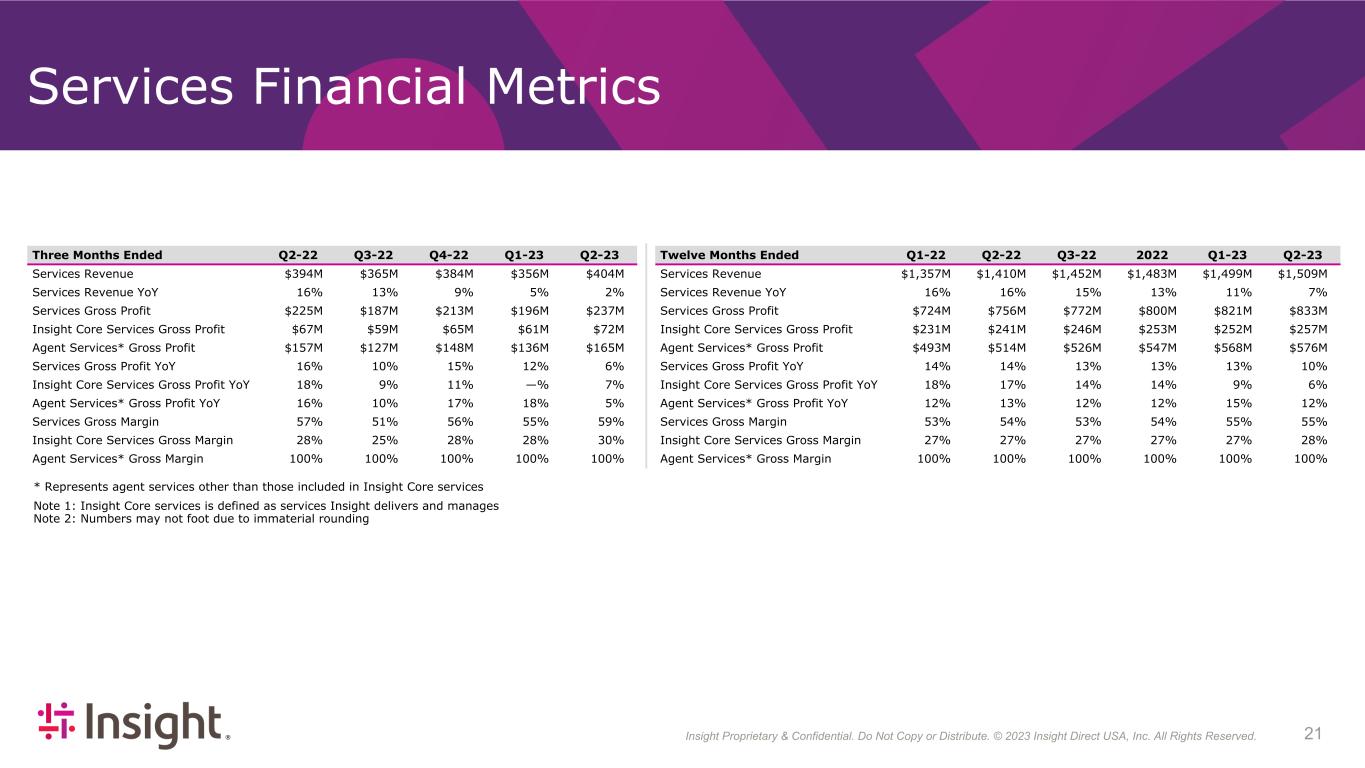 Insight Proprietary & Confidential. Do Not Copy or Distribute. © 2022 Insight Direct USA, Inc. All Rights Reserved. 213 Services Financial Metrics Three Months Ended Q2-22 Q3-22 Q4-22 Q1-23 Q2-23 Services Revenue $394M $365M $384M $356M $404M Services Revenue YoY 16% 13% 9% 5% 2% Services Gross Profit $225M $187M $213M $196M $237M Insight Core Services Gross Profit $67M $59M $65M $61M $72M Agent Services* Gross Profit $157M $127M $148M $136M $165M Services Gross Profit YoY 16% 10% 15% 12% 6% Insight Core Services Gross Profit YoY 18% 9% 11% —% 7% Agent Services* Gross Profit YoY 16% 10% 17% 18% 5% Services Gross Margin 57% 51% 56% 55% 59% Insight Core Services Gross Margin 28% 25% 28% 28% 30% Agent Services* Gross Margin 100% 100% 100% 100% 100% Twelve Months Ended Q1-22 Q2-22 Q3-22 2022 Q1-23 Q2-23 Services Revenue $1,357M $1,410M $1,452M $1,483M $1,499M $1,509M Services Revenue YoY 16% 16% 15% 13% 11% 7% Services Gross Profit $724M $756M $772M $800M $821M $833M Insight Core Services Gross Profit $231M $241M $246M $253M $252M $257M Agent Services* Gross Profit $493M $514M $526M $547M $568M $576M Services Gross Profit YoY 14% 14% 13% 13% 13% 10% Insight Core Services Gross Profit YoY 18% 17% 14% 14% 9% 6% Agent Services* Gross Profit YoY 12% 13% 12% 12% 15% 12% Services Gross Margin 53% 54% 53% 54% 55% 55% Insight Core Services Gross Margin 27% 27% 27% 27% 27% 28% Agent Services* Gross Margin 100% 100% 100% 100% 100% 100% * Represents agent services other than those included in Insight Core services Note 1: Insight Core services is defined as services Insight delivers and manages Note 2: Numbers may not foot due to immaterial rounding